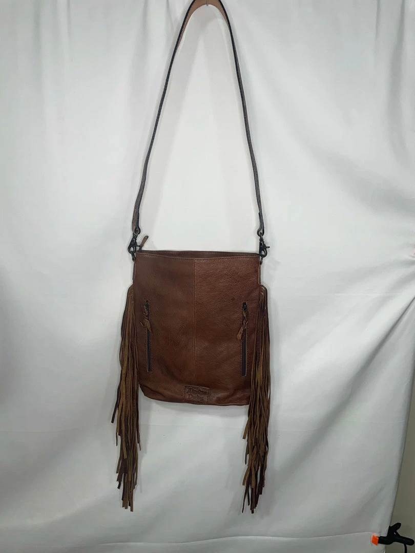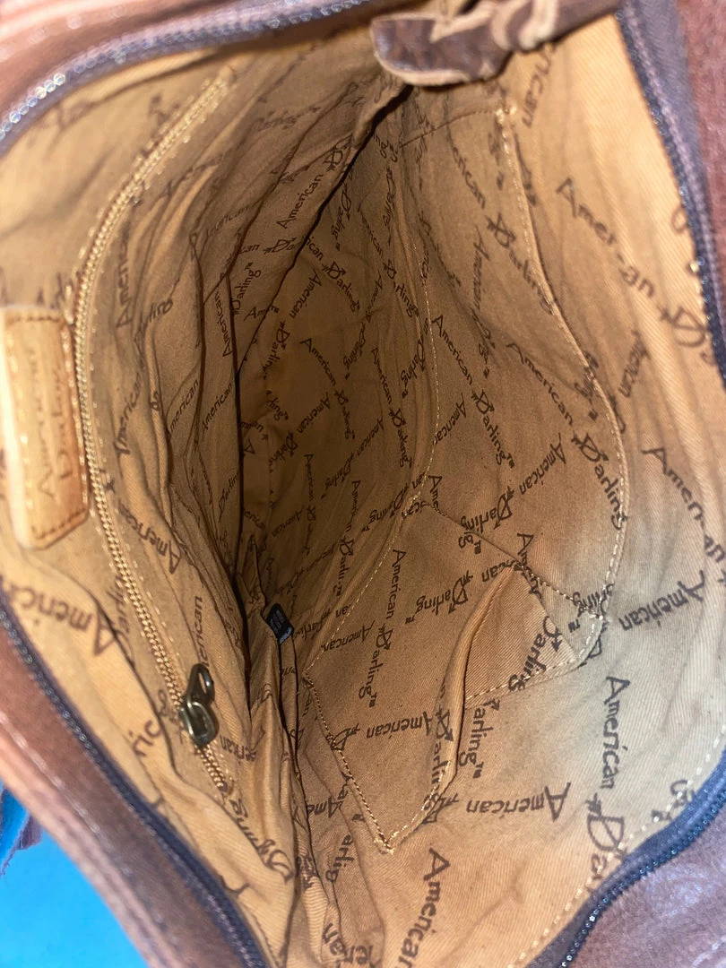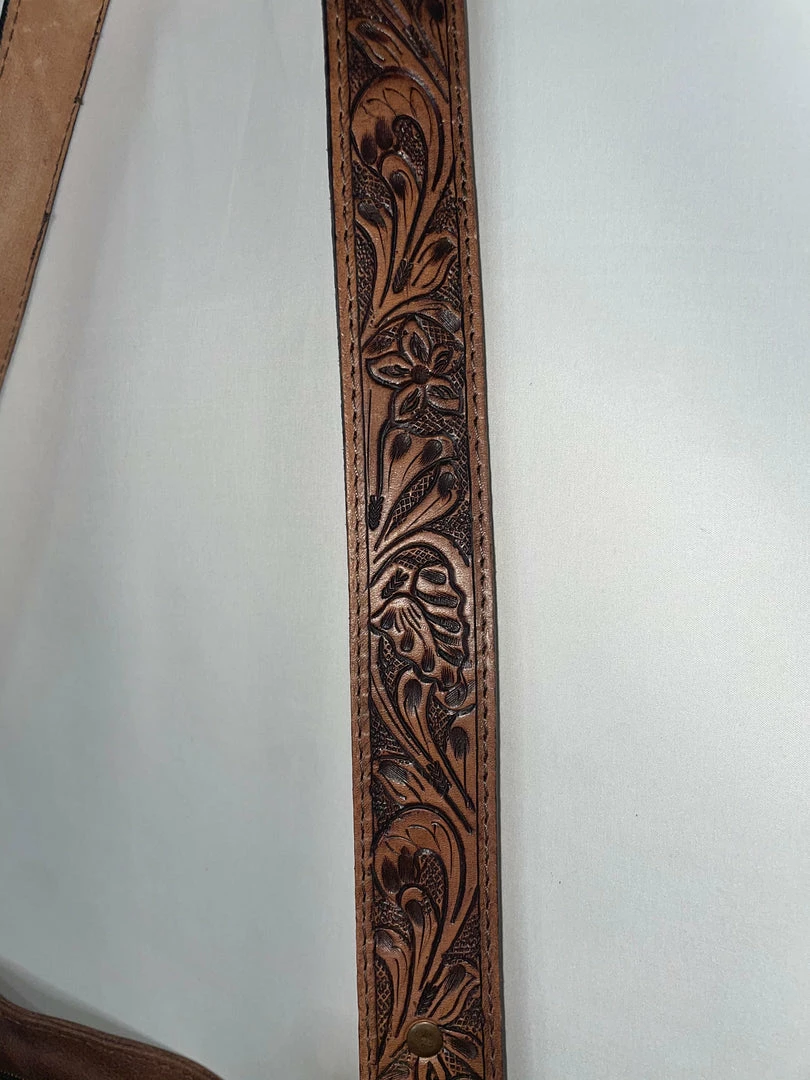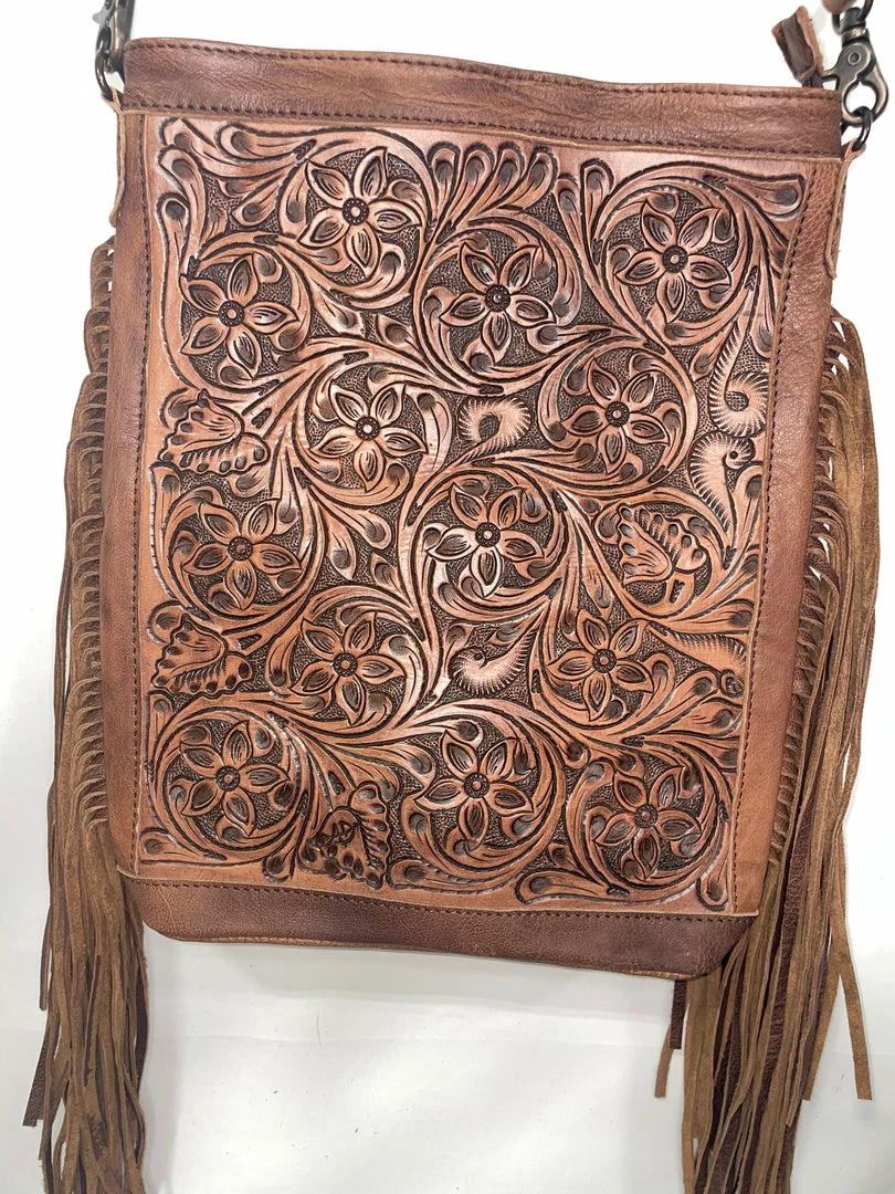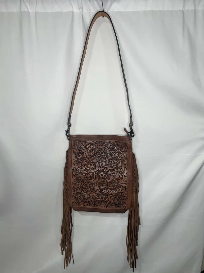 This American Darling tooled leather purse and strap has us head over heels! It has three inside pockets and one outside. The strap is removable and fringe on the side!