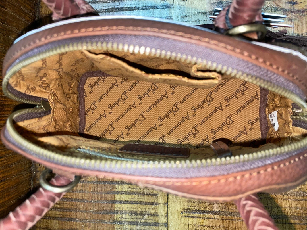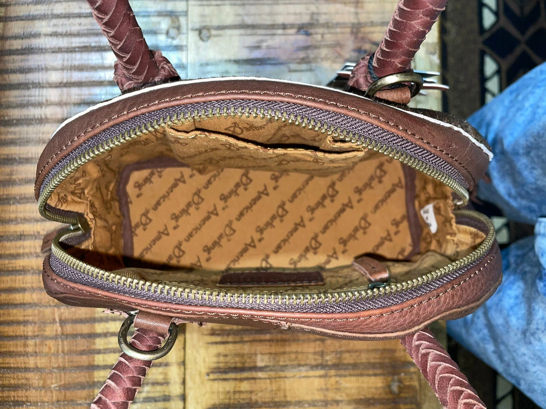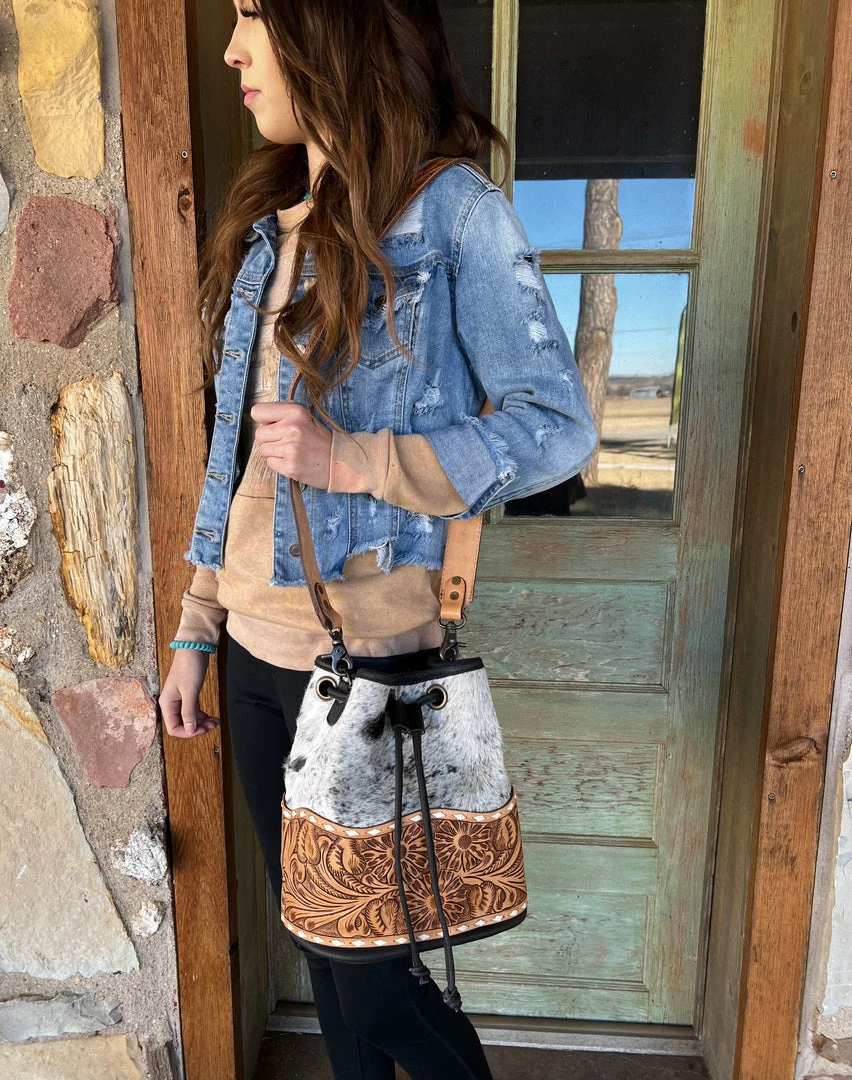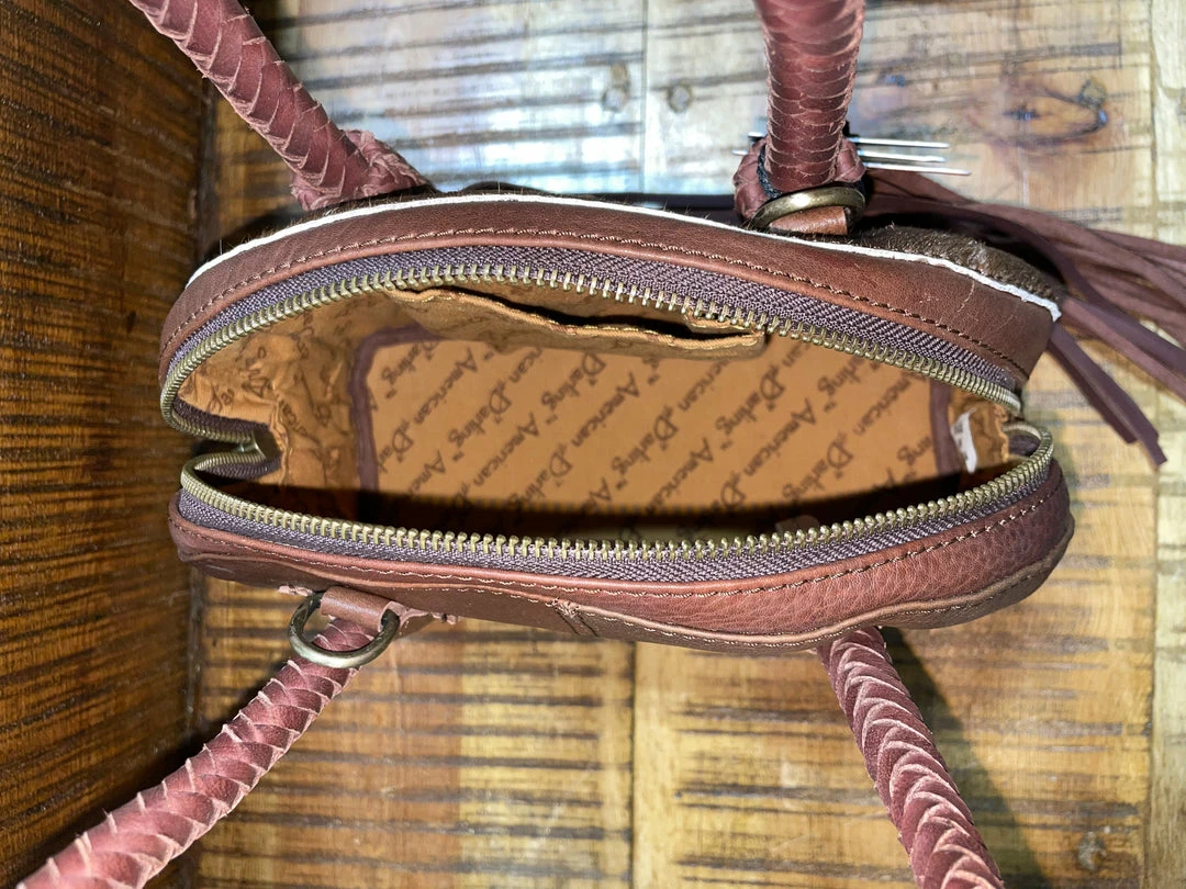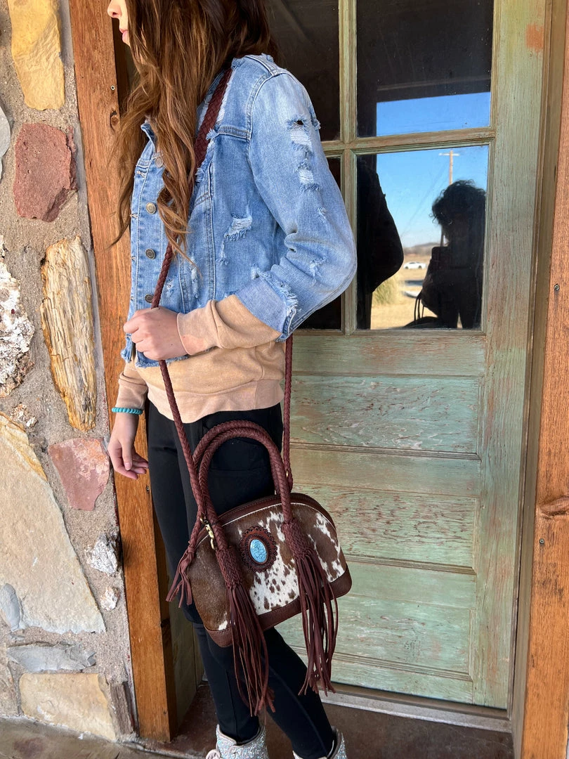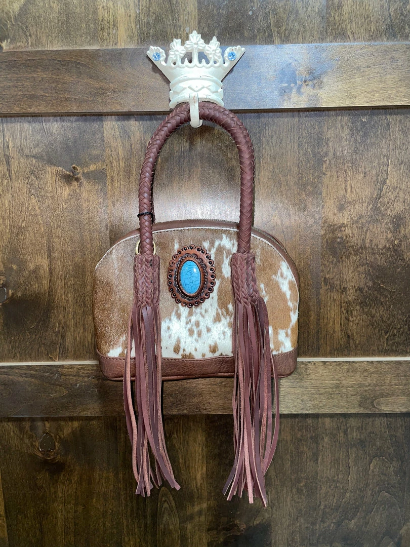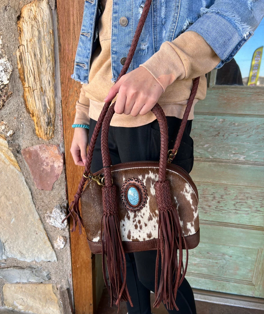 This adorable little purse is perfect for those days you need something light to carry. The faux turquoise stone is going to have everyone drooling with it being mixed with the cowhide and fringe detailing.