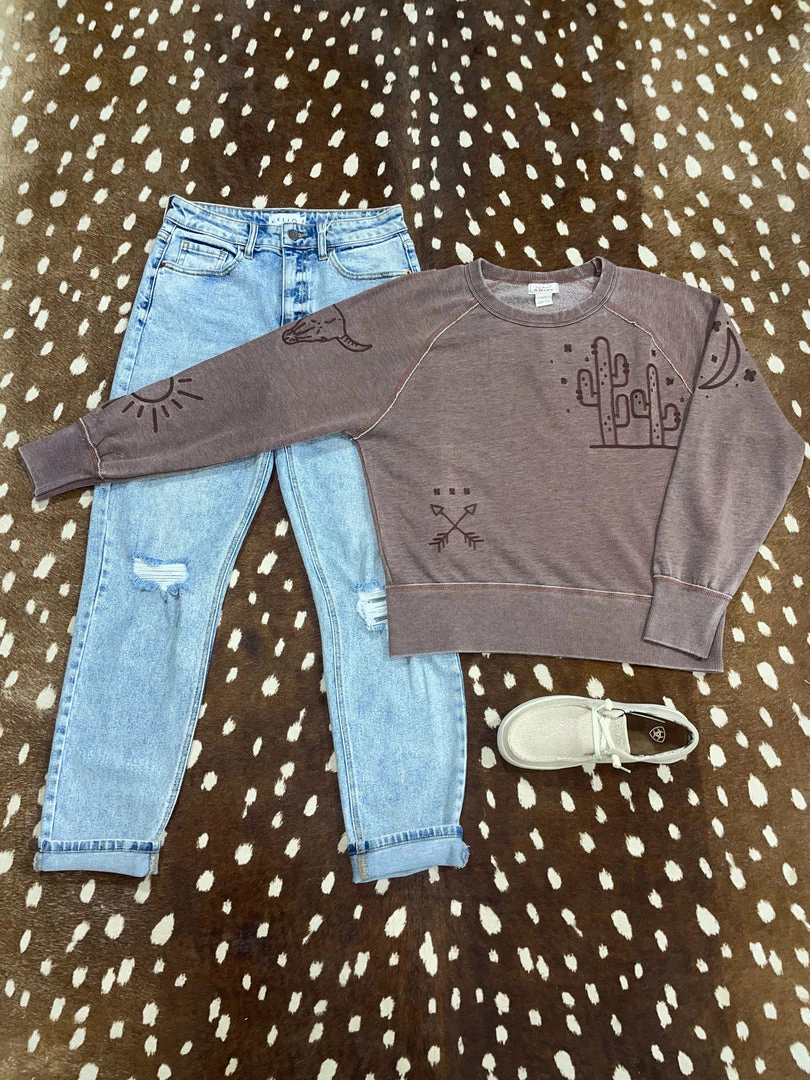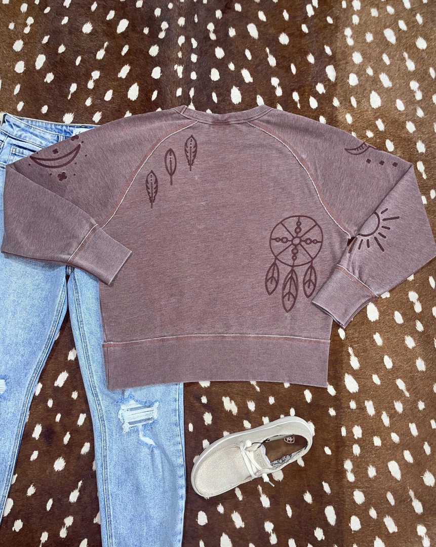 The comfiest and warmest sweatshirt! All the designs on it, the feather, the dreamcatcher, buffalo skull, sun and moon, cactus and arrows are absolutely beautiful. It truly tells what everything once was.