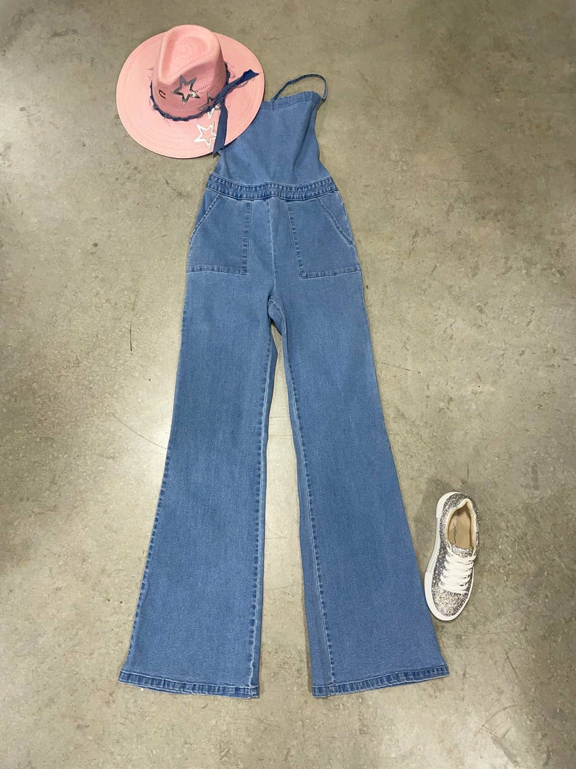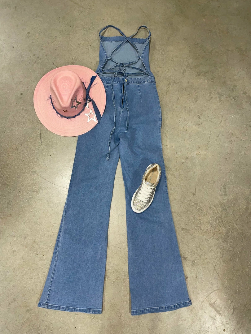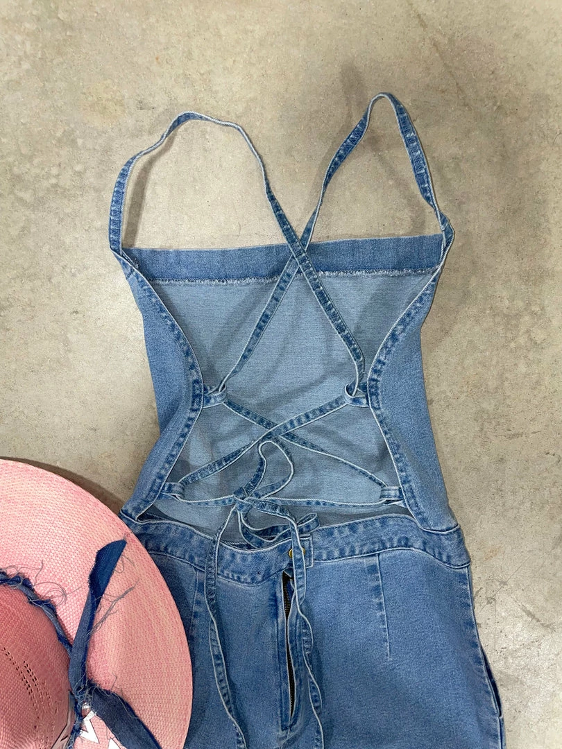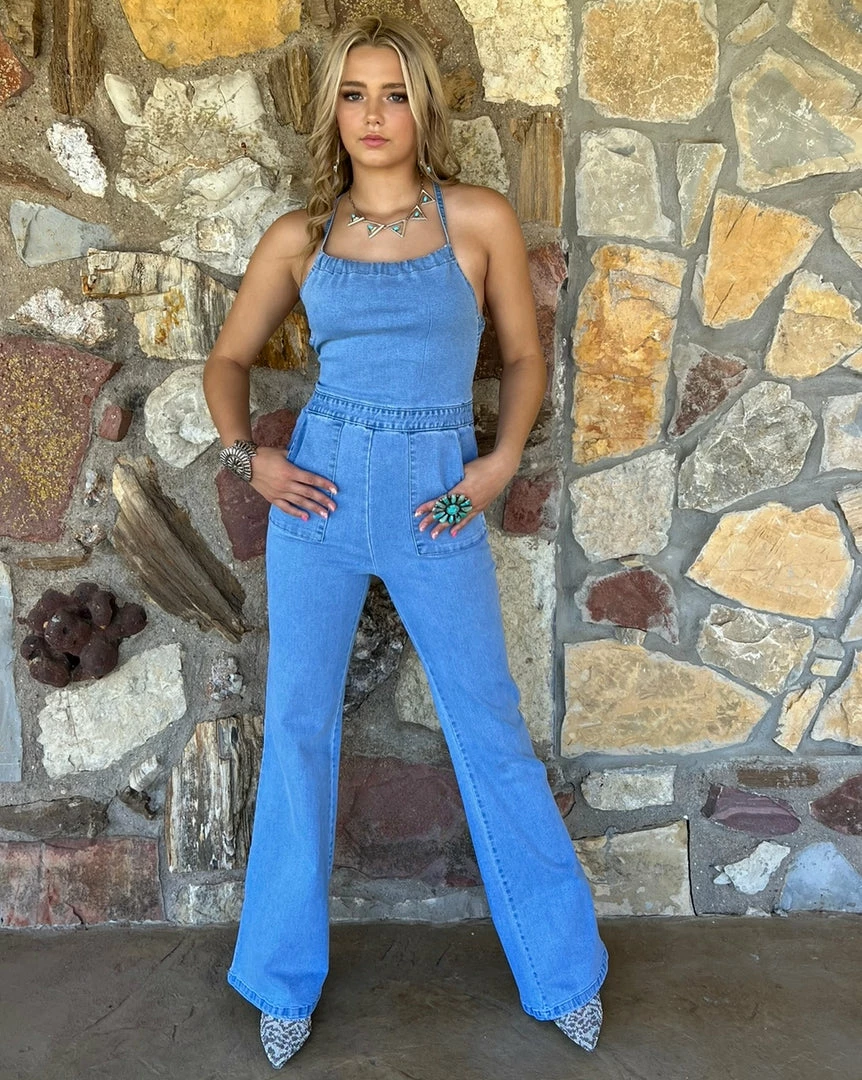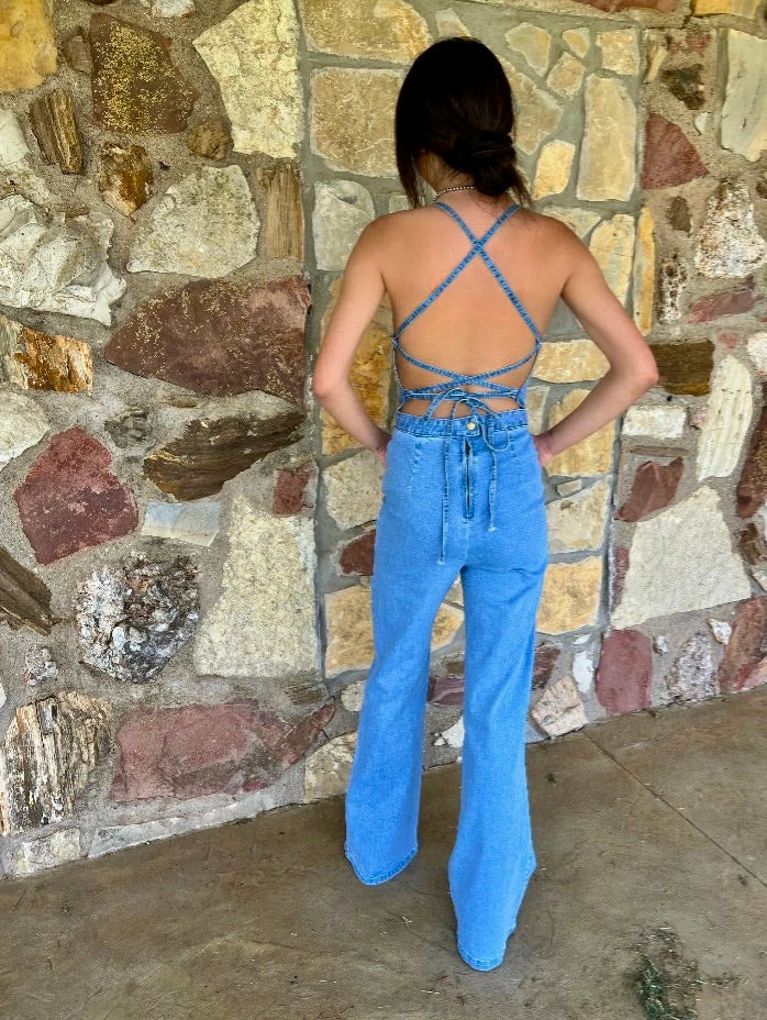 We’re loving everything about this jumpsuit possible. The corset-like ties in the back, the light wash denim, the halter top, the flowiness, literally everything about this jumpsuit is what we’ve been dreaming of!
