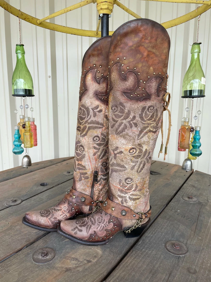 These Corral Boots are everything!! They feature a great snip toe with a beautiful sand coloring body with chocolate roses embroidered throughout! They also feature a gorgeous chocolate colored harness around the heel with detailed studding throughout!