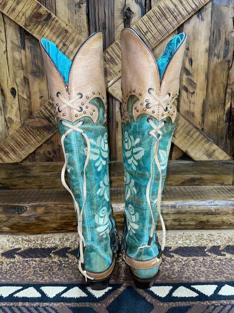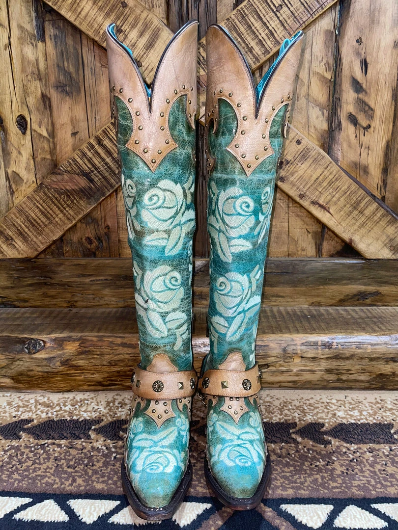 These Corral Boots are everything!! They feature a great snip toe with a beautiful turquoise coloring body with cream roses embroidered throughout! They also feature a gorgeous buckskin colored harness around the heel with detailed studding throughout!