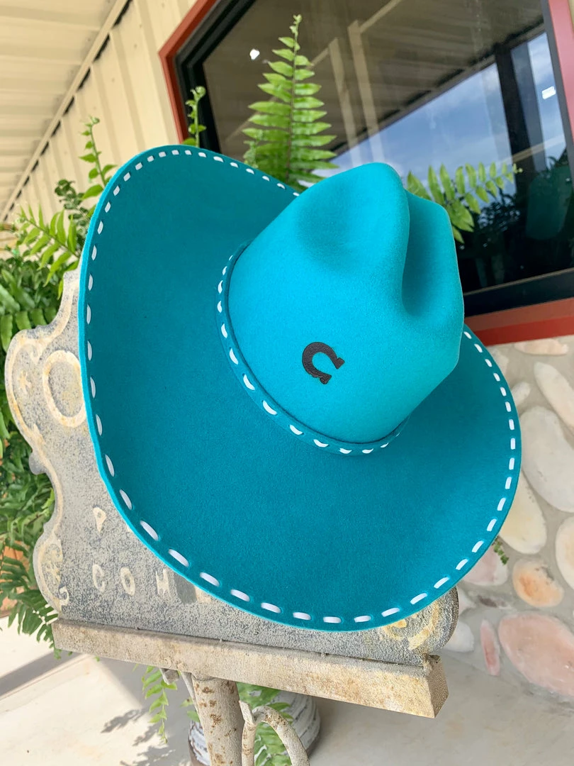 This sleek black felt cowboy hat is perfect with white stitching to give it some pop! It is perfect for any outfit!
