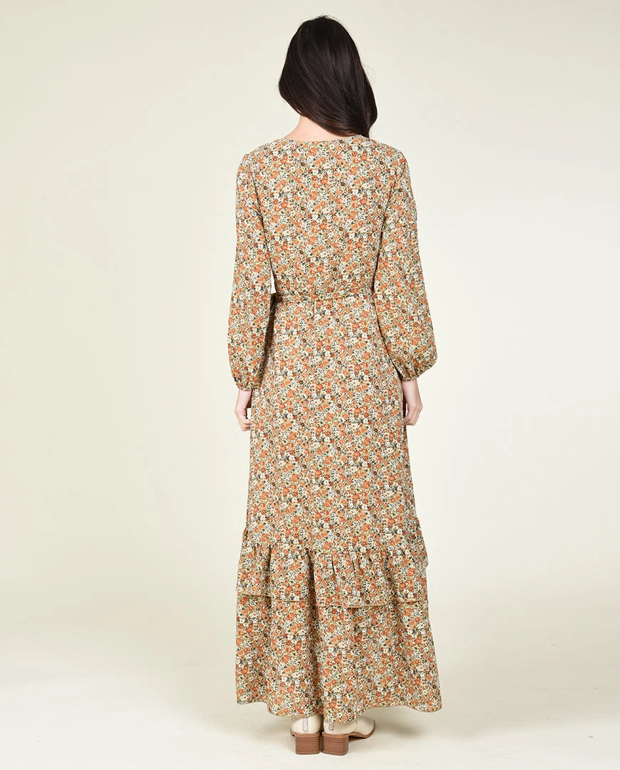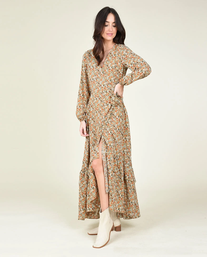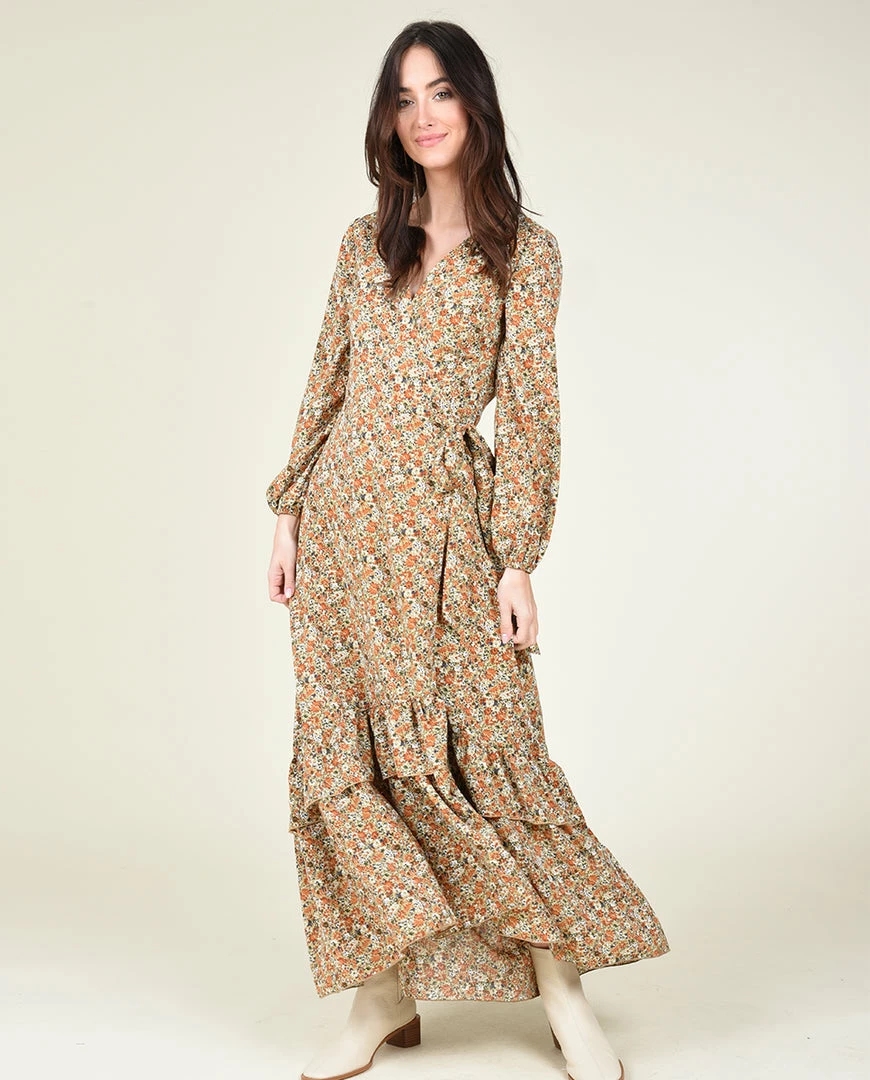 This ankle-length, fully lined wrap dress with a snap enclosure at the chest is perfect for fall!