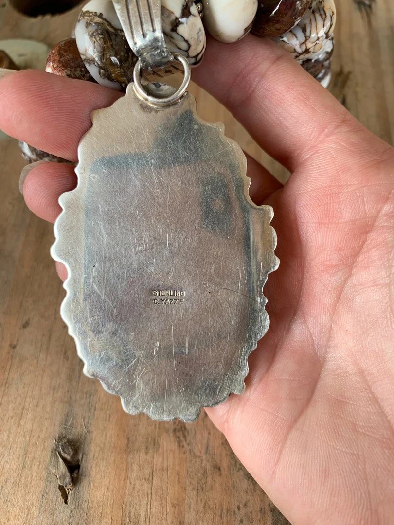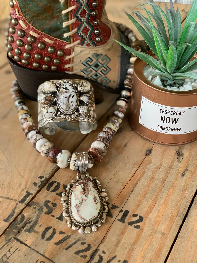 Necklace: 22.5” of beautifully polished hand strung Crazy Horse Stones, with the addition of 2 perfectly placed sterling silver Navajo Pearls.