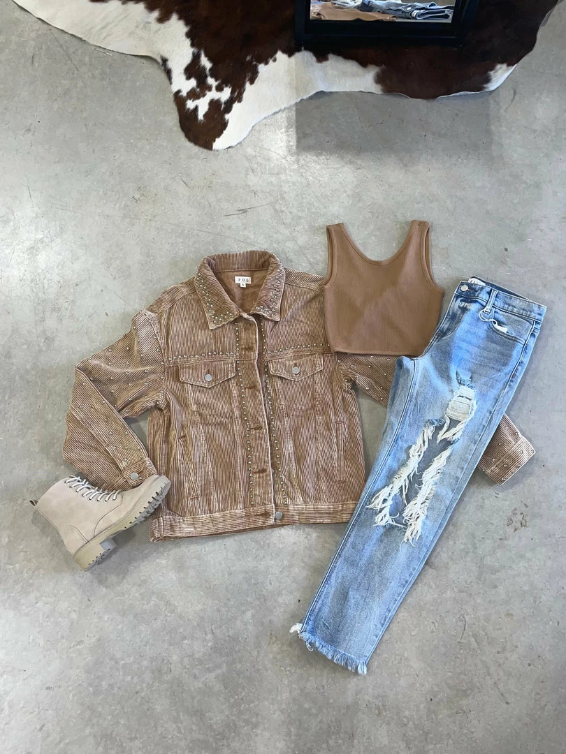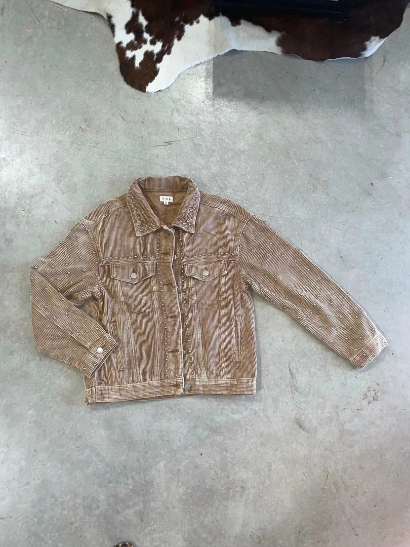 This oversized corduroy, woven shacket complete with silver studs is sure to have you turning heads this season!