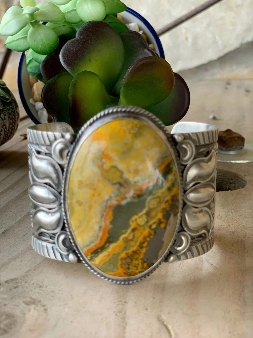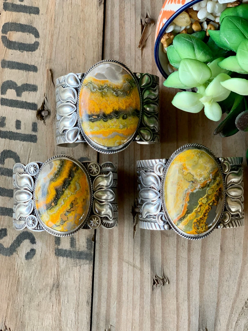Beautifully handcrafted sterling silver settings created by our favorite designer showcase hand selected bumblebee jasper stones to create the perfect statement piece to compliment your next outfit.