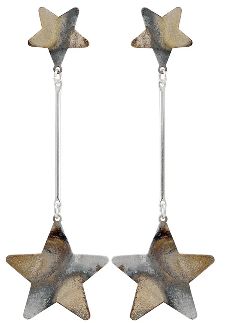 Handmade in Brazil. A small shiny star post that gracefully holds by a stick a dangling medium size radiant star will light up your look!