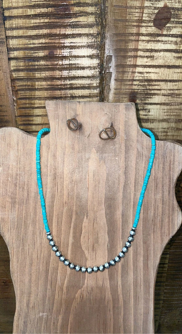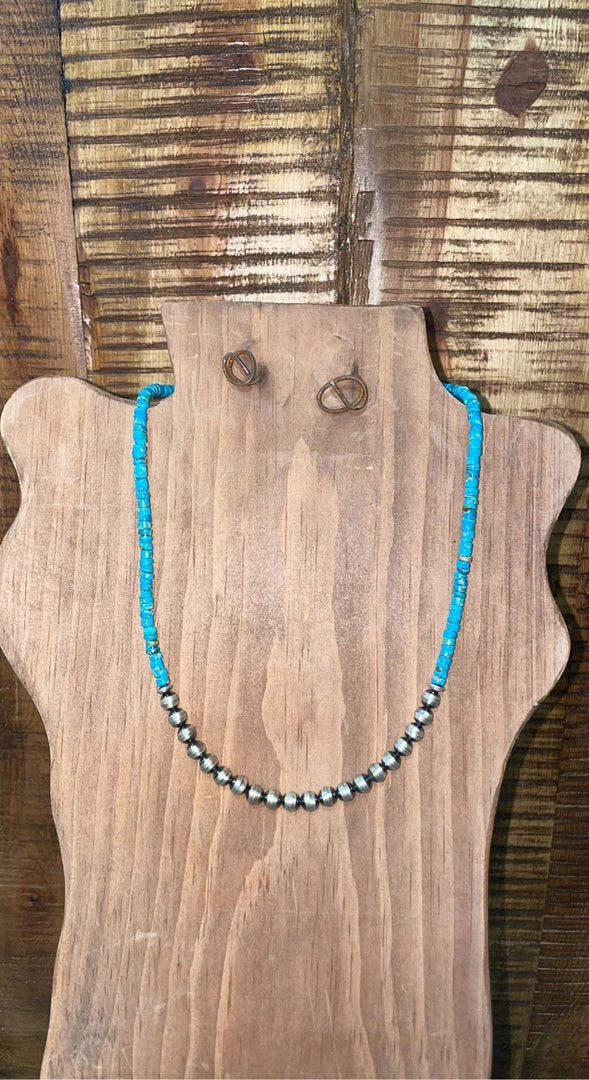 18” authentic turquoise necklace with sterling silver Navajo pearls to spice it up in the middle.