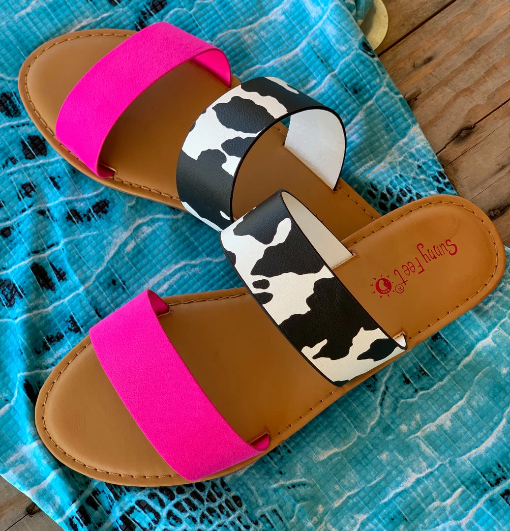 These fun pink and black and white cow print sandals are perfect for your summer time outfits!!