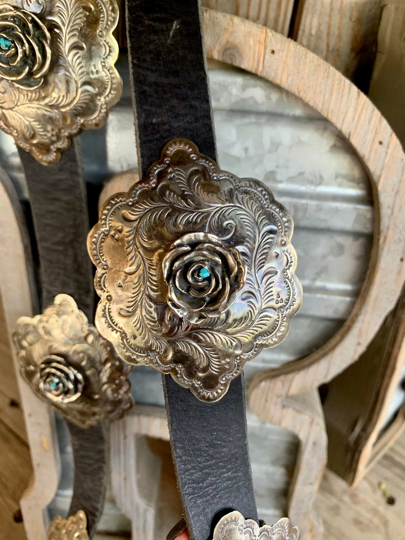 A black leather band with a elegant feather engraving that surrounds a 3D rosette with a stud of turquoise in the middle. it has 6 conchos including the buckle.