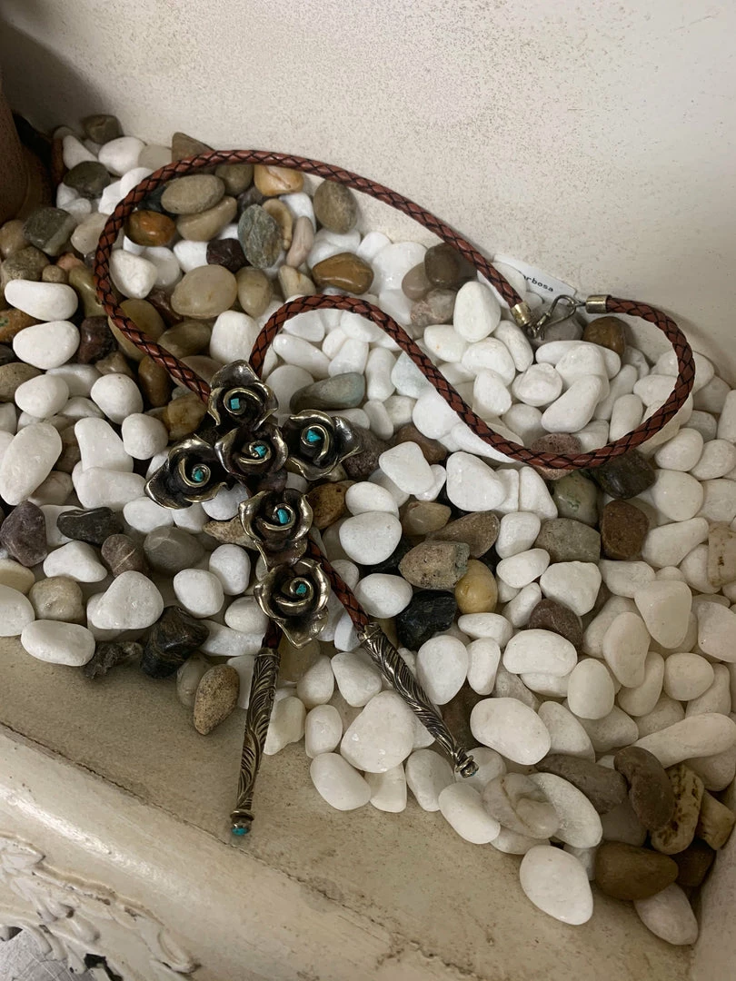 Rose Cactus Bolo by Barbosa. This necklace is gorgeous! It is a braided leather necklace with a stunning cross shaped with roses. It is finished with little turquoise accents.