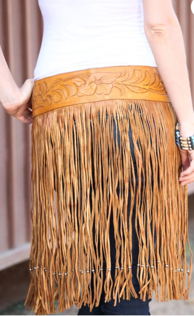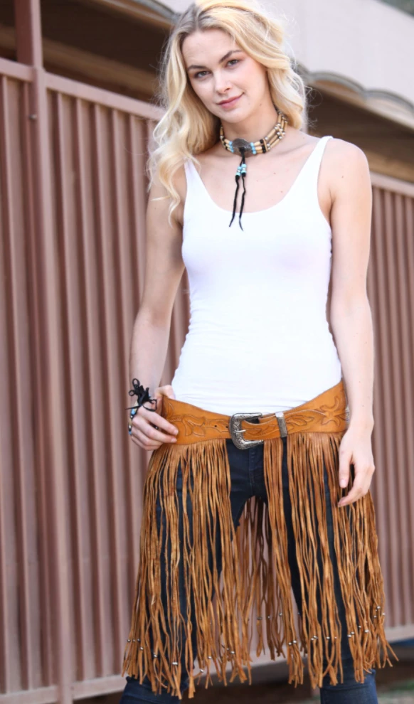 Amazing western belt with fabulous fringe hanging! This belt features beads at the bottom of the fringe. Throw this on over any outfit for the perfect accessory!