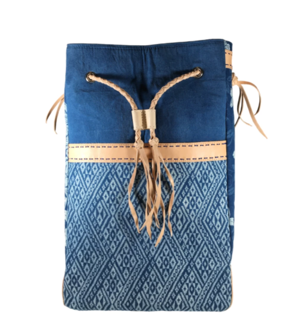 - Leather cinch straps to close the bag, Interior slide pockets and zipper pocket, Genuine leather handle and accents