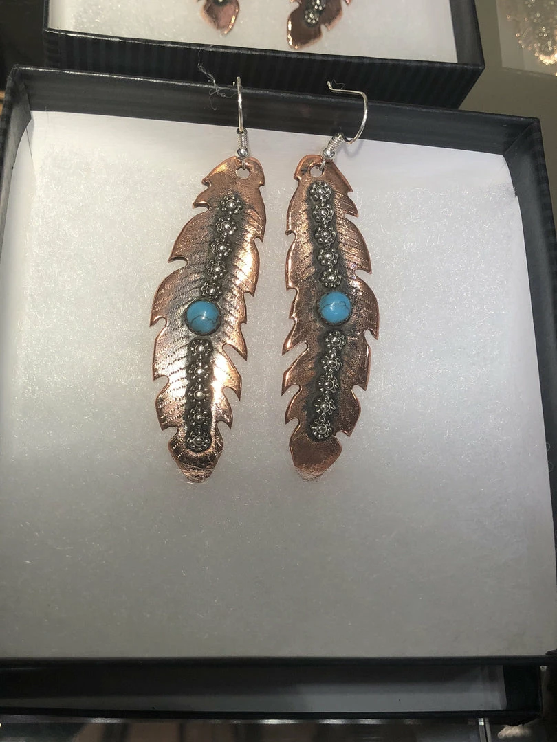 Stunning Copper & Sterling Silver Feather Earrings With Turquoise Embellishments.