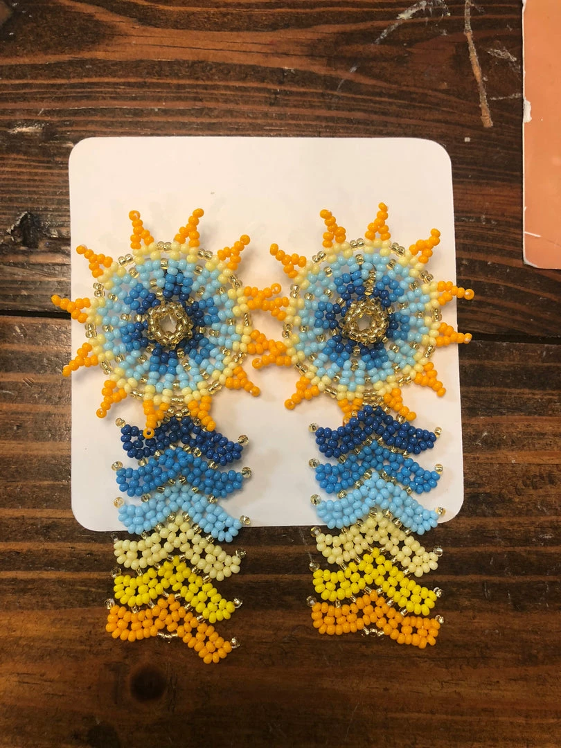 Beaded earrings with yellow, orange, light blue, medium blue, and navy blue beads arranged in a unique and beautiful design.