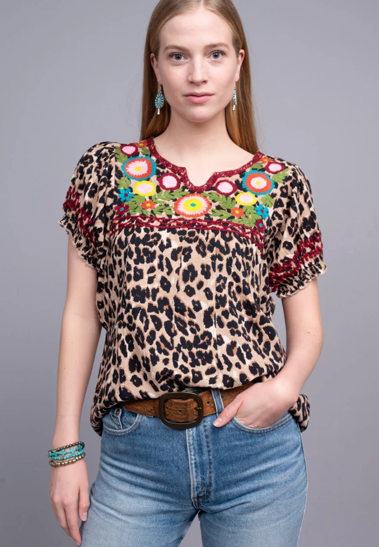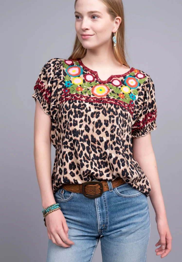 Go wild with this top! The perfect blend of animal and floral embroidery!
