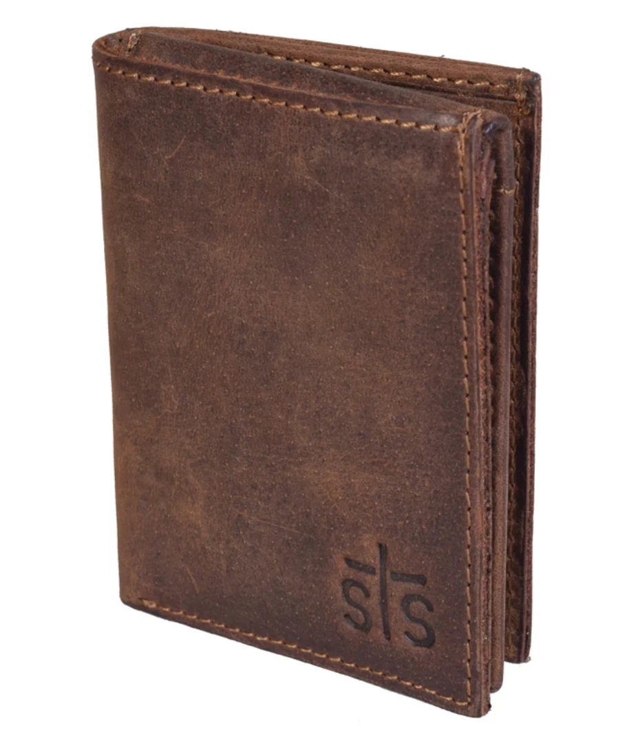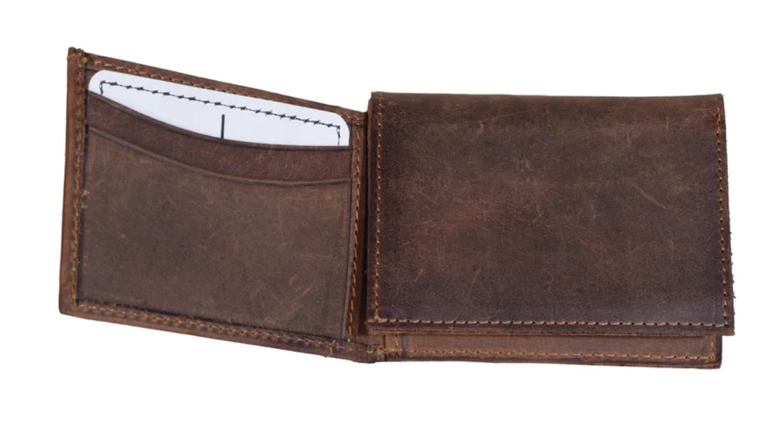 The Foreman Trifold is a dynamic wallet that flips open to reveal a secondary flip for more card and currency storage.