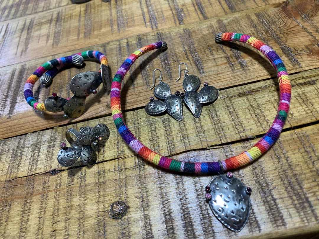 Barbosa always creates the most beautiful pieces! This Serape Nopal Bracelet is on a colorful serape band with cactus conchos attached.