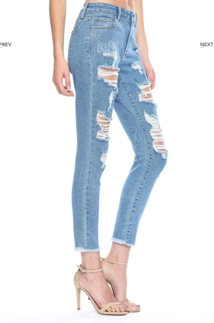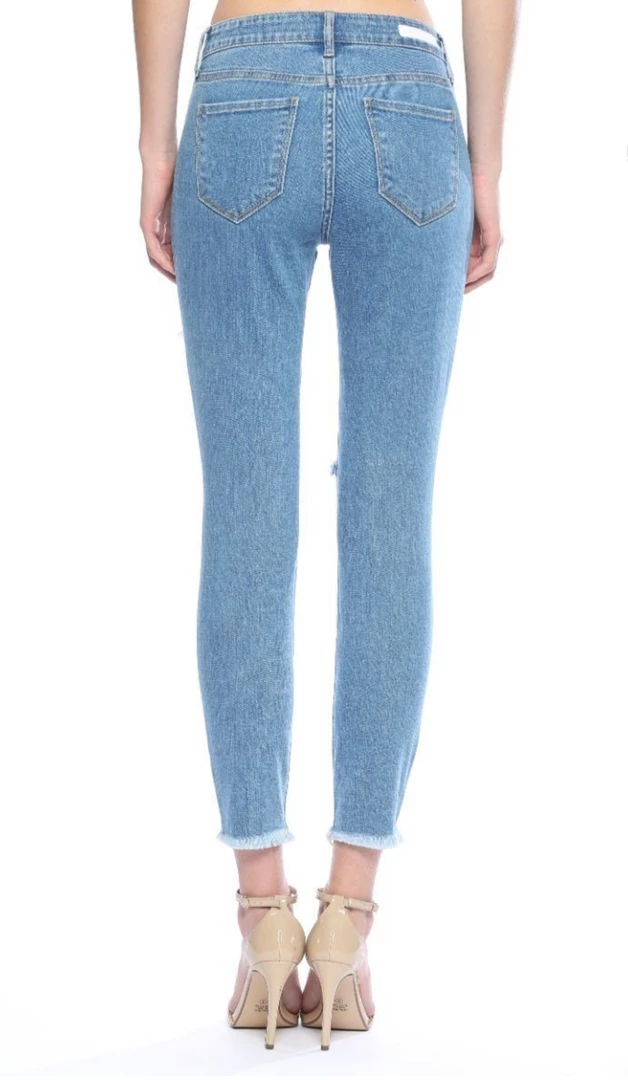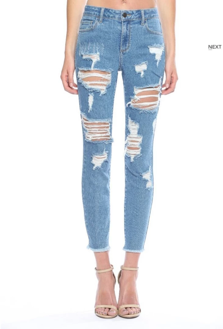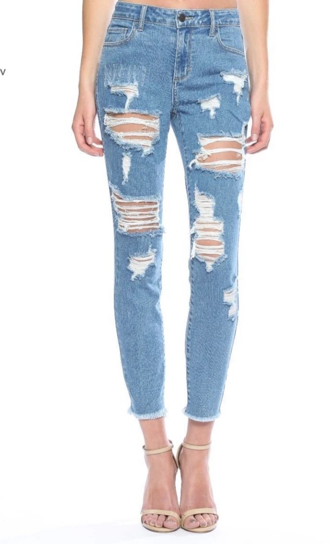 These skinny jeans are sure to be your favorite, most comfortable pair thanks to their destructed detailing, soft, subtle stretch fabric, comfy mid rise fit and timeless blue wash. Additionally equipped with five pockets, belt loops and a zip fly closure!