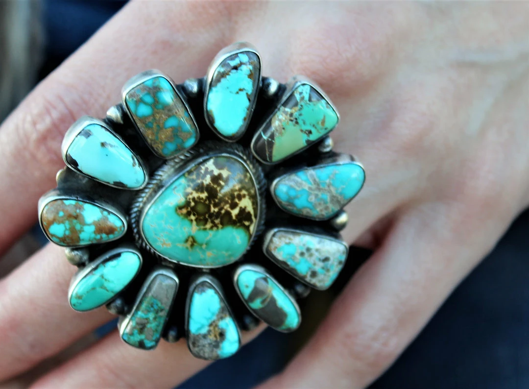 This would make an amazing addition to anyone’s collection! This heavy, large, chunky turquoise ring displays stones of rare form and exquisite quality.