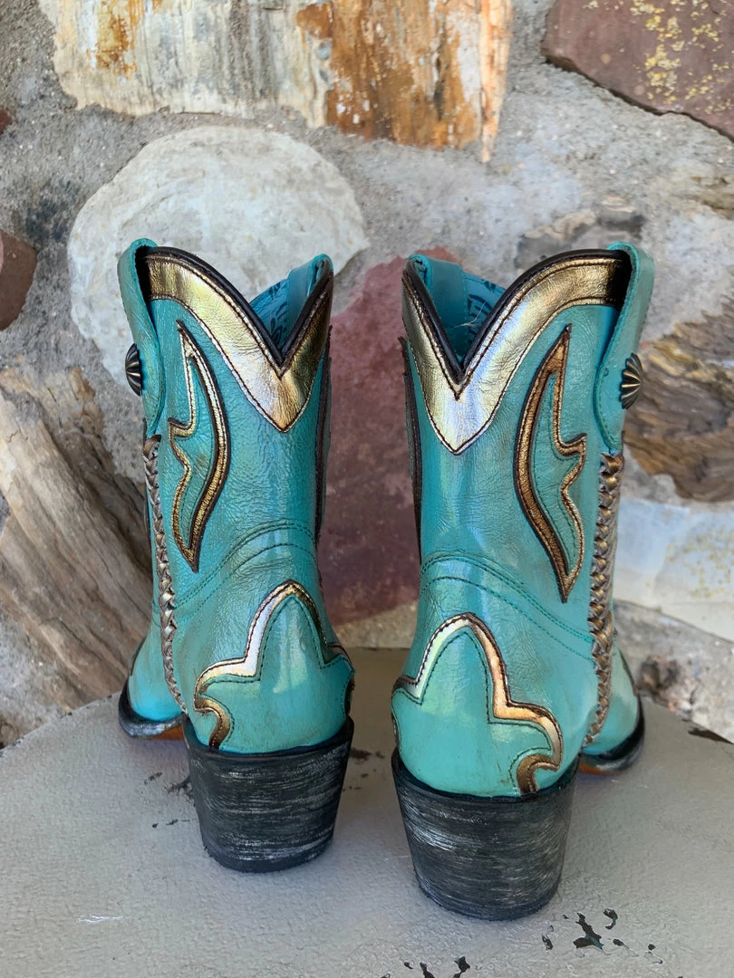 Have you ever seen a bootie this perfect?!? These boots give us major Miranda Lambert vibes! They are turquoise with an antique wash and gold metallic accent designs. The braid down both sides is the icing on the cake!!!