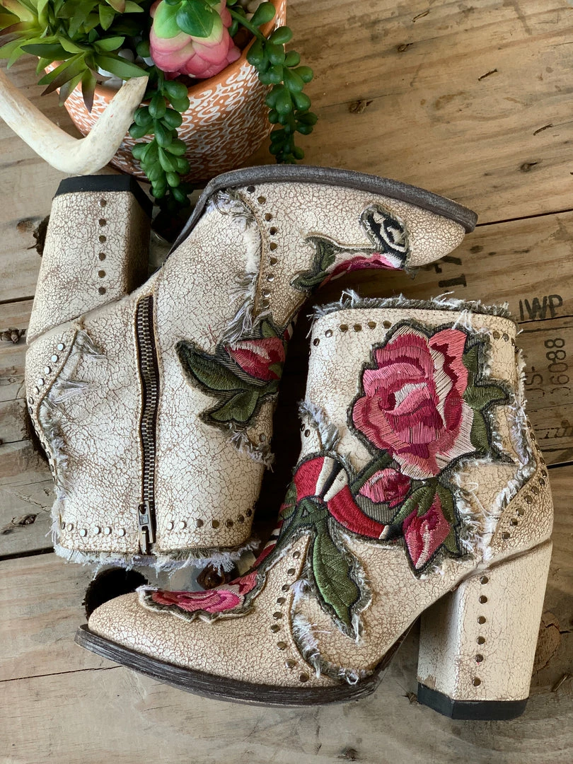 Whimsical floral patchwork with frayed finish gives this boot an ultra-rugged look. Distressed white leather with dusty rose overlay adds to that ruggedness. The stud detailing on the heels gives it an extra oomph.