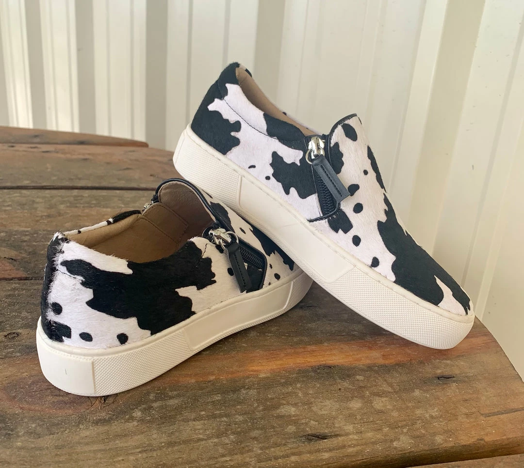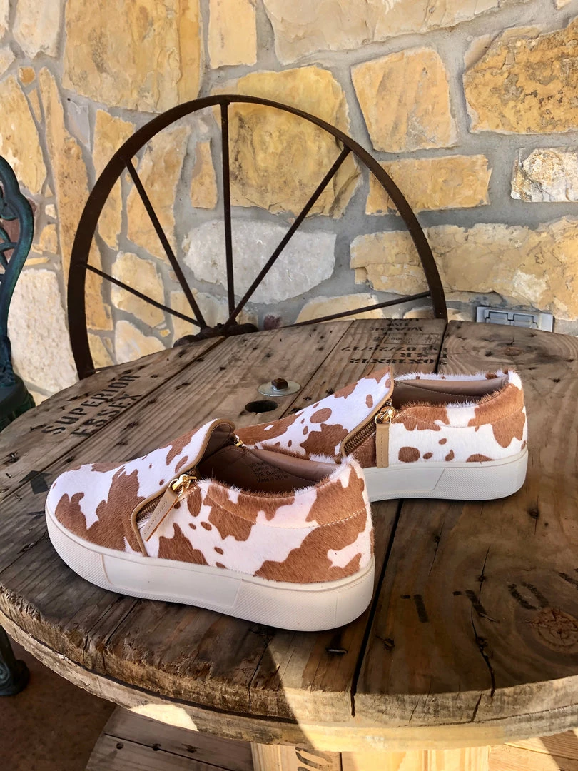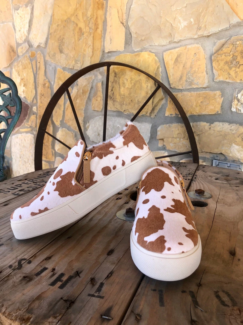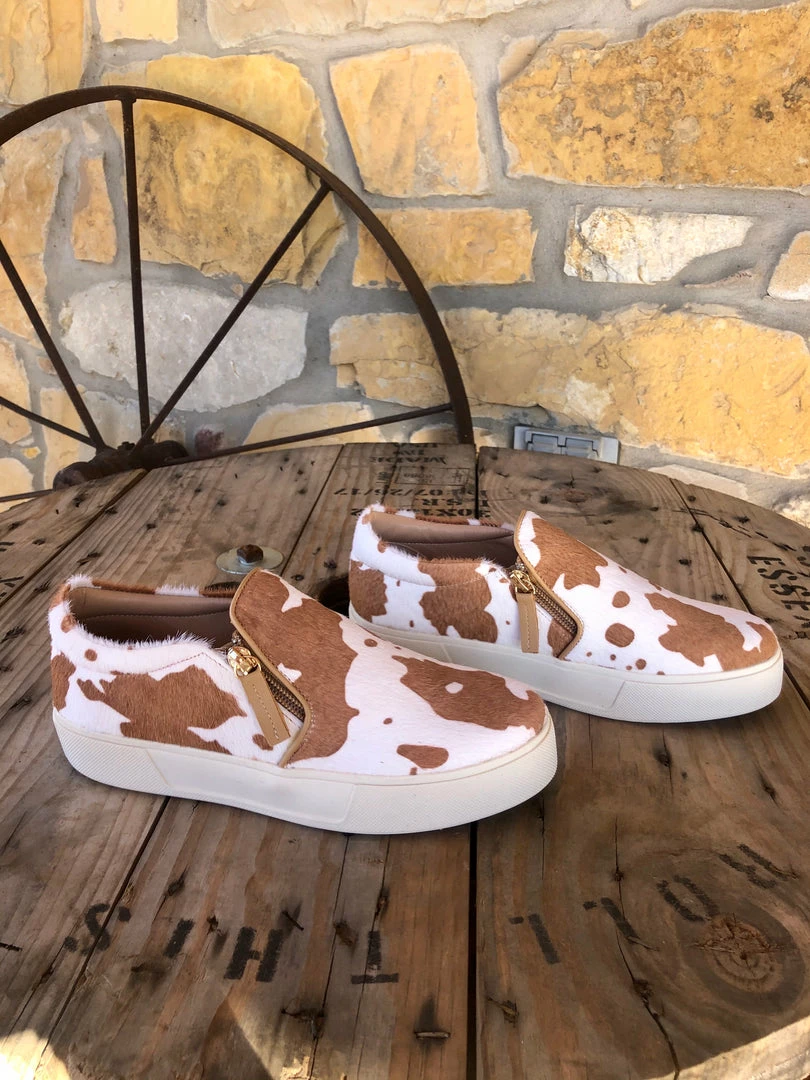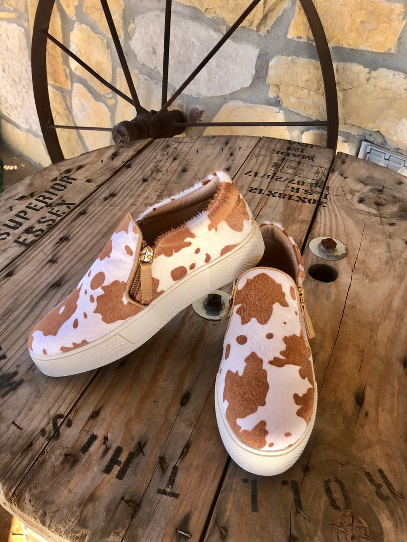 These sneakers are super cute! They are available in 2 different colors: a light brown hair and black hair on hide cow print with two side zippers and a rubber sole!