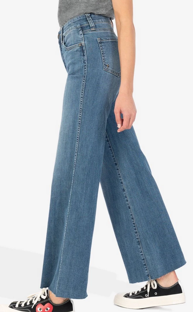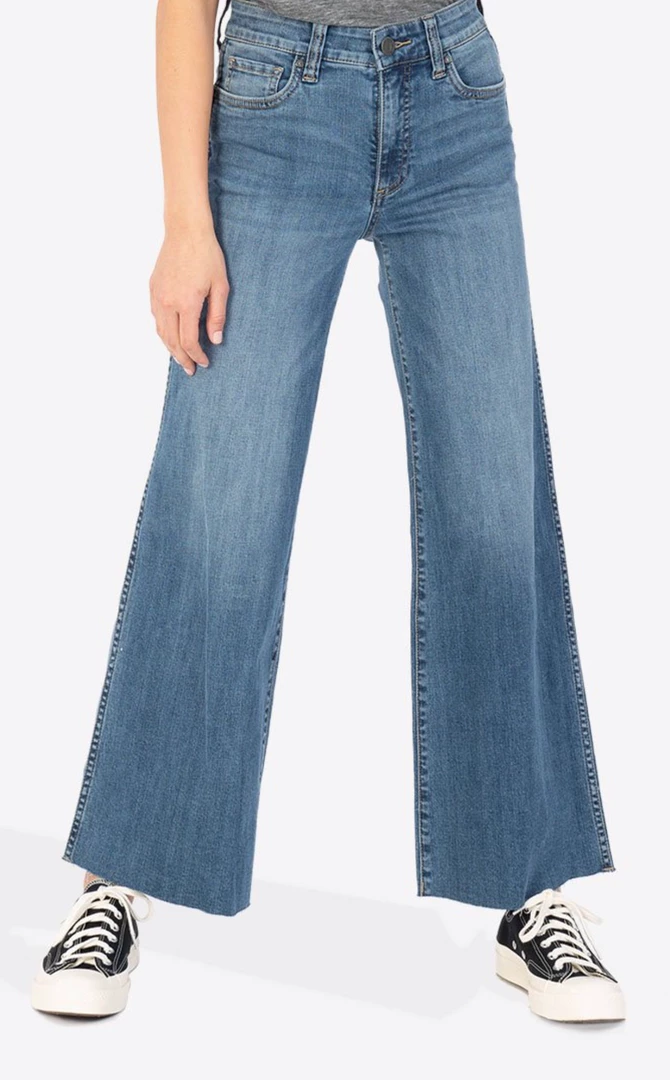 - Designed with front pocket technique that is flattening, slenderizing and provides comfort. This wide leg style gives a vintage feel to any look. The medium base wash is perfect for everyday and goes with anything it’s paired with!