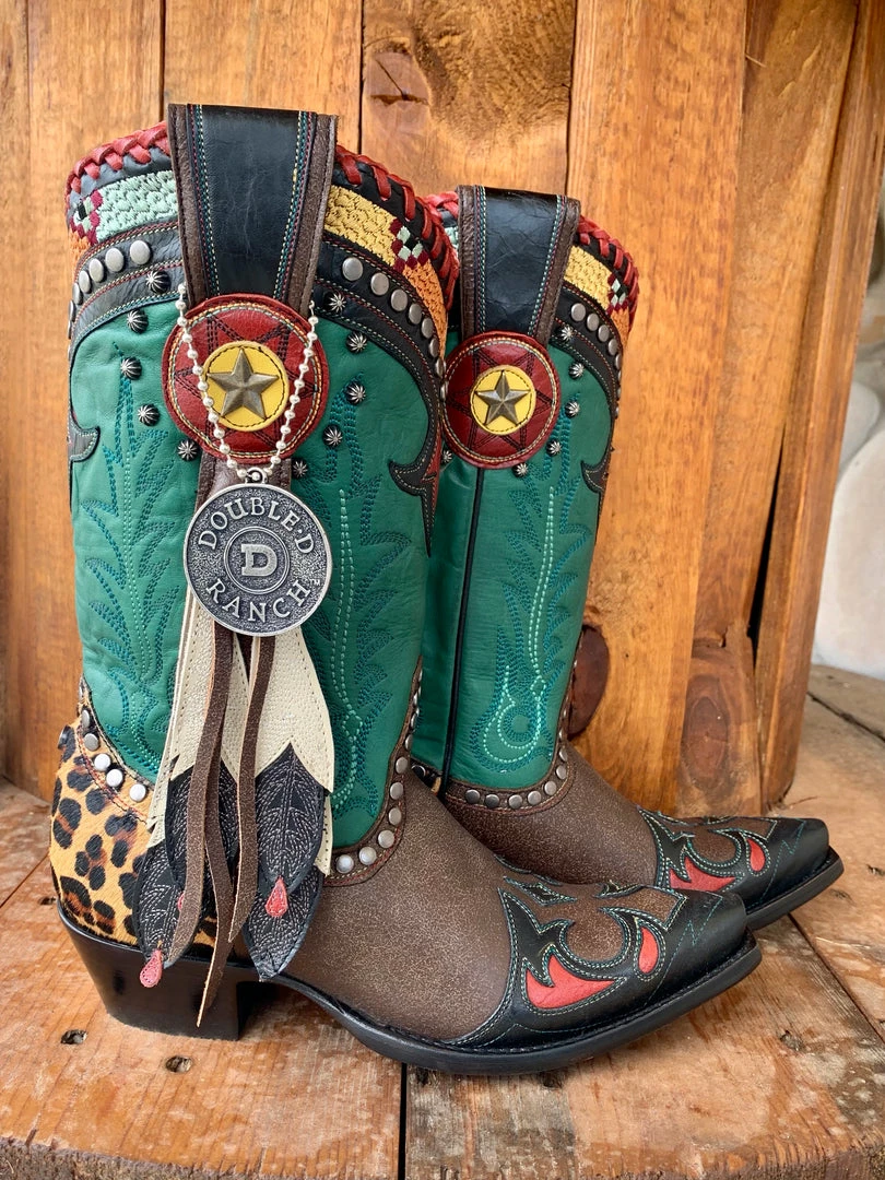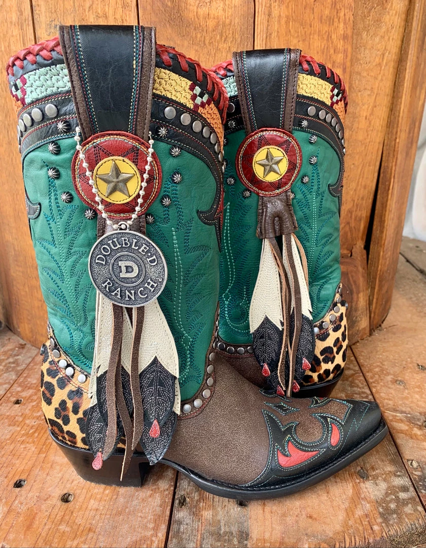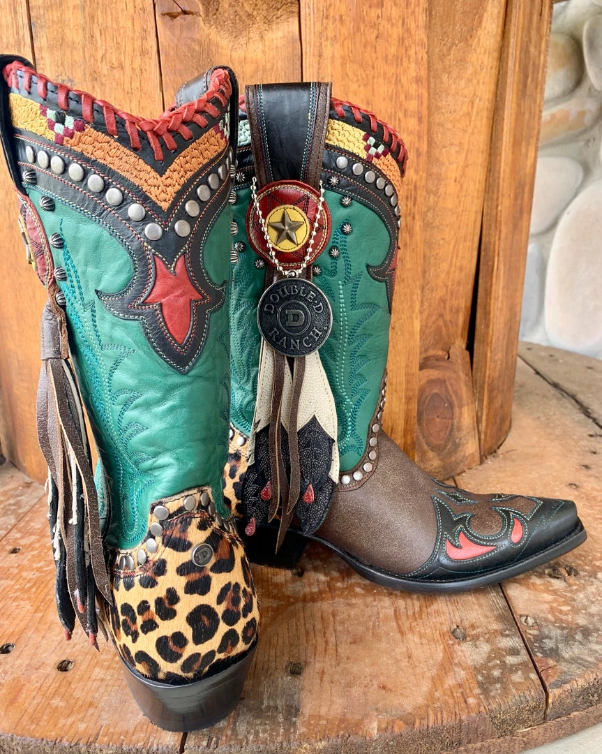 The chic color-block design brings together unexpected color combinations, even incorporating some fierce flame-like red and black on the toebox and hair-on-hide leopard on the heel. Accented with interesting elements like a Texas-style star and some sleek studs, the real standout on these statement boots is the pair of leather feathers and tassels hanging down the gorgeous green mid-length shaft. Great movement, great color, great style — these are going to be a fan favorite for years to come!