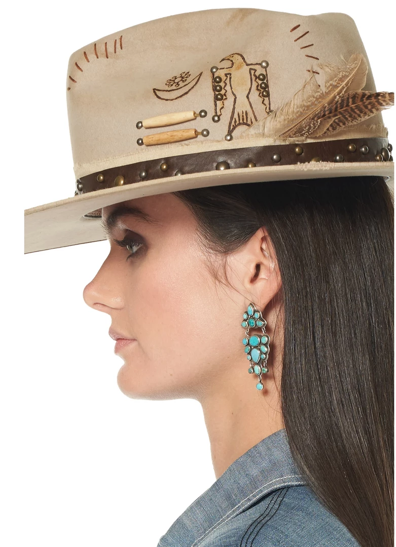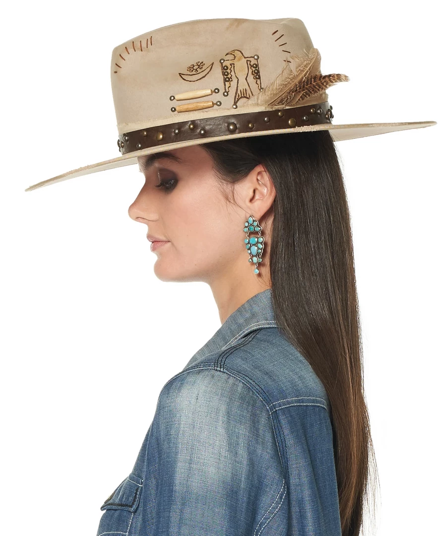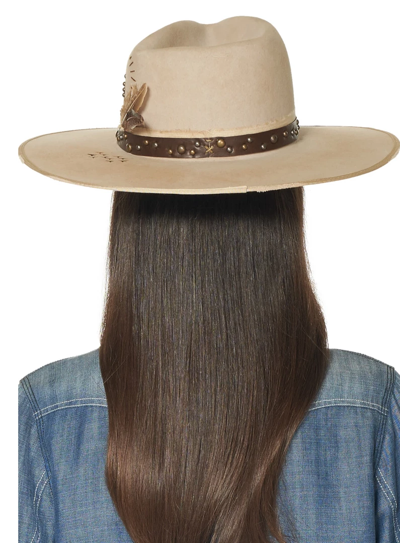 This striking “silver belly” hat features a pinched crown embellished with printing and embroidery images, unique wooden beads, and metallic studding. The hatband is a strip of brown leather accented with an assortment of metallic studs and accompanied by two feathers. It’s a versatile neutral that’s anything but ordinary!