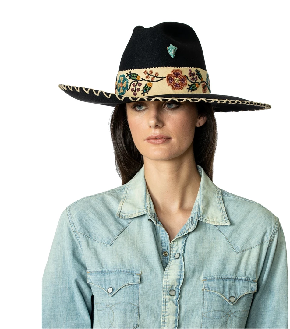 You’re gonna be a showstopper in the Showman Hat! This beautiful felt topper features a wide brim with a leather-laced edge and sassy slight cock to it, a statement-making wide suede hand-beaded hatband, and little ol’ buffalo for good measure.