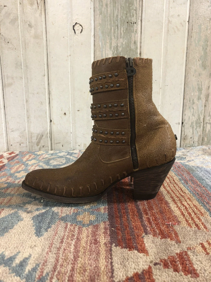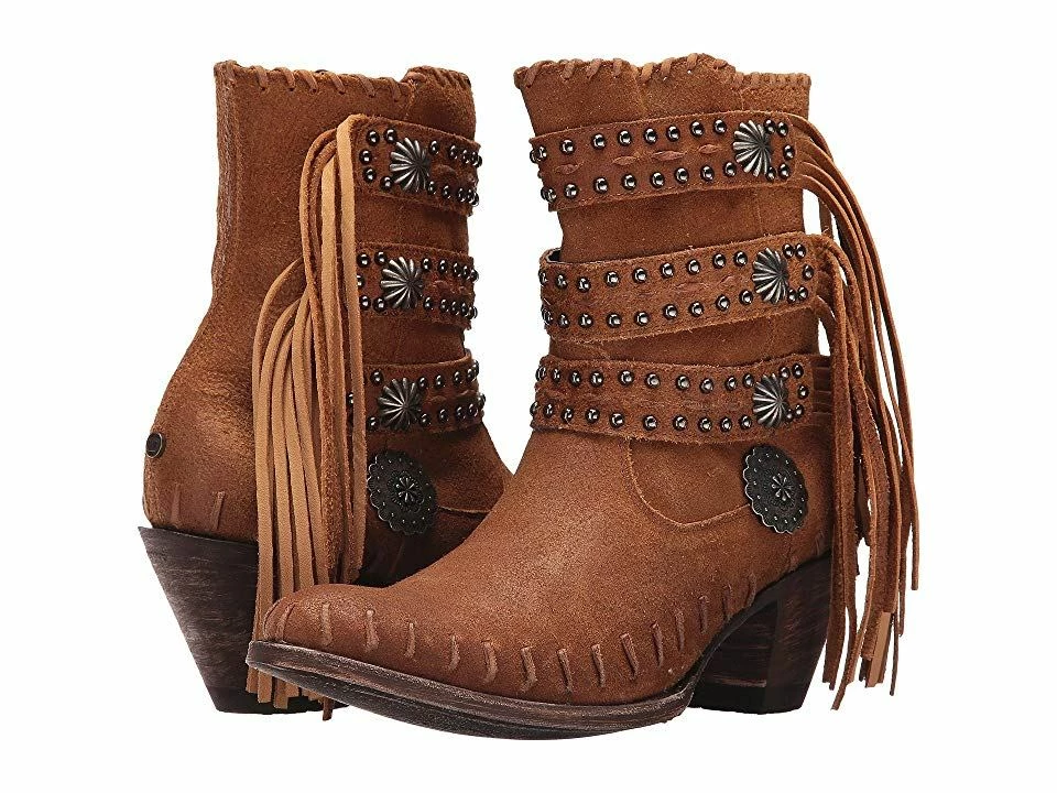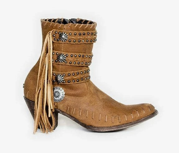 Double D Ranch Old Gringo short Taos People boots with stitching, studs, and fringe detailing.