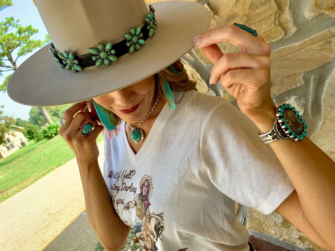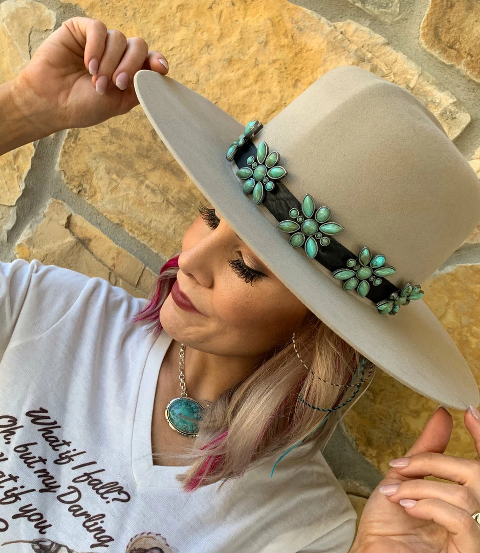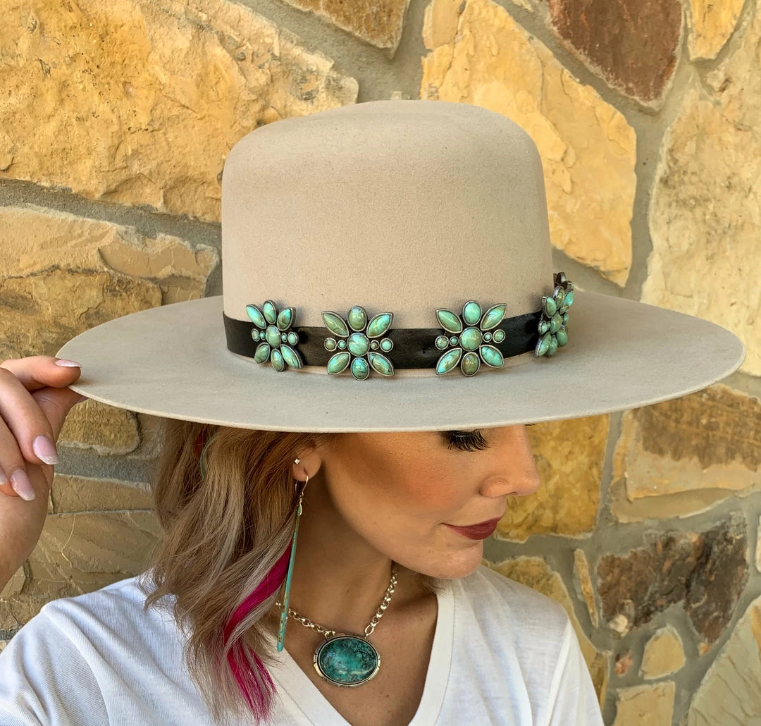 Double D Ranch size medium color- Yellowbelly round top cowboy hat with turquoise accents on a brown leather hat band. Super fun hat perfect for summer or fall to add a little pop of color to any outfit!