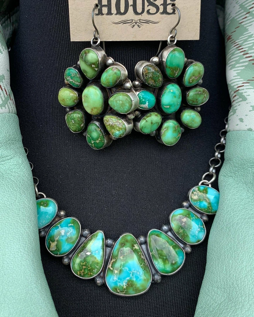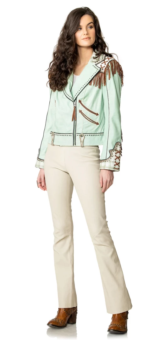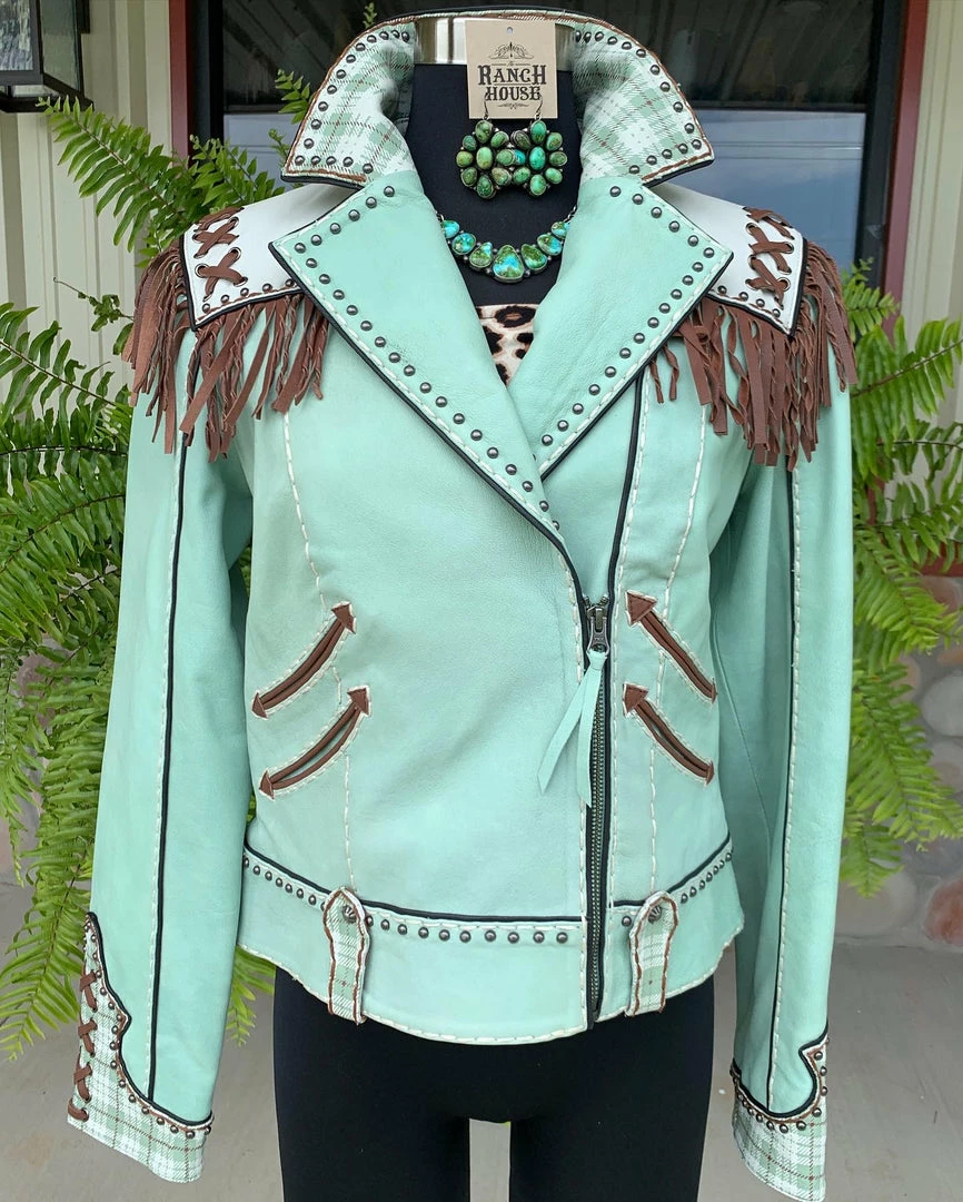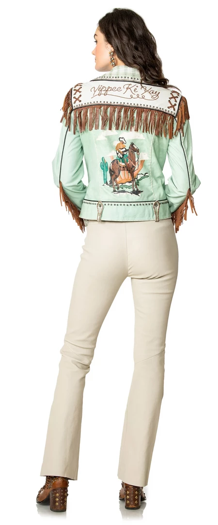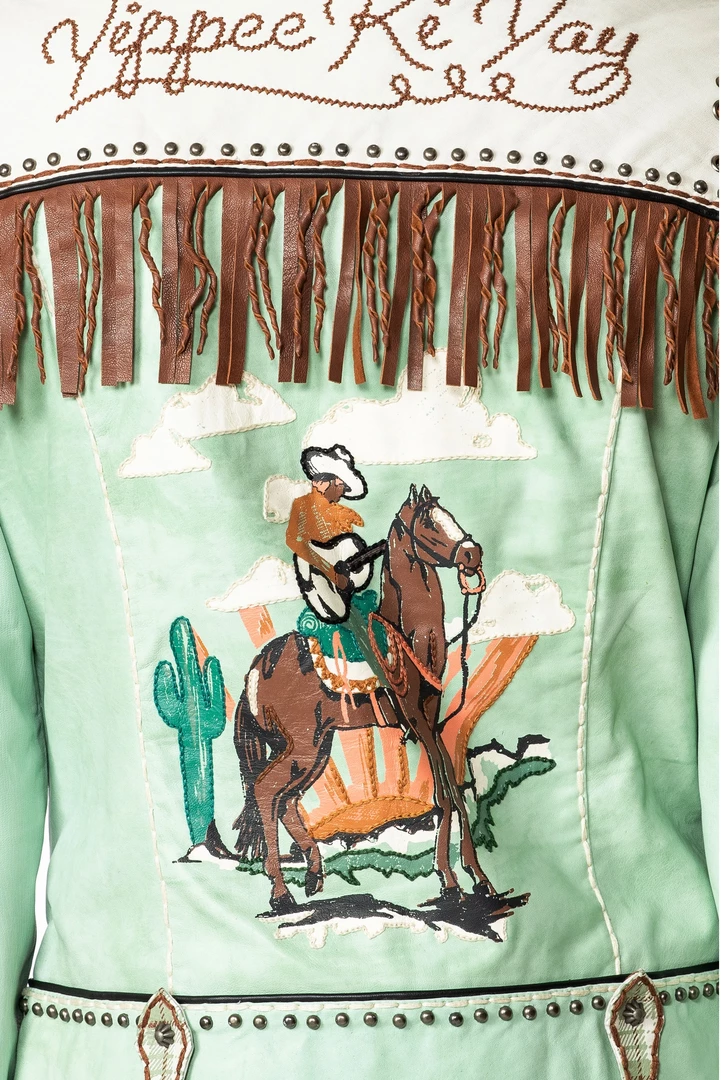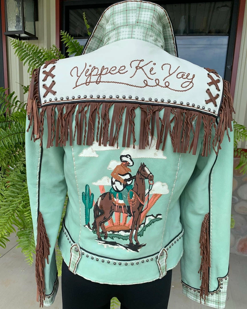 The soft mint color is reminiscent of mid-century tailfin Cadillacs and the colorful illustration of a guitar-clad horseback cowboy evokes nostalgia of small screen Westerns in their heyday. The jacket is a classic zip-front silhouette, trimmed with contrast piping and Western welts. The collar and cuffs feature an awesome detail of subtle windowpane plaid, and the khaki yoke boasts the words “Yippee Ki Yay” across the back with crisscross leather lace details and every cowgirl’s favorite – fringe!