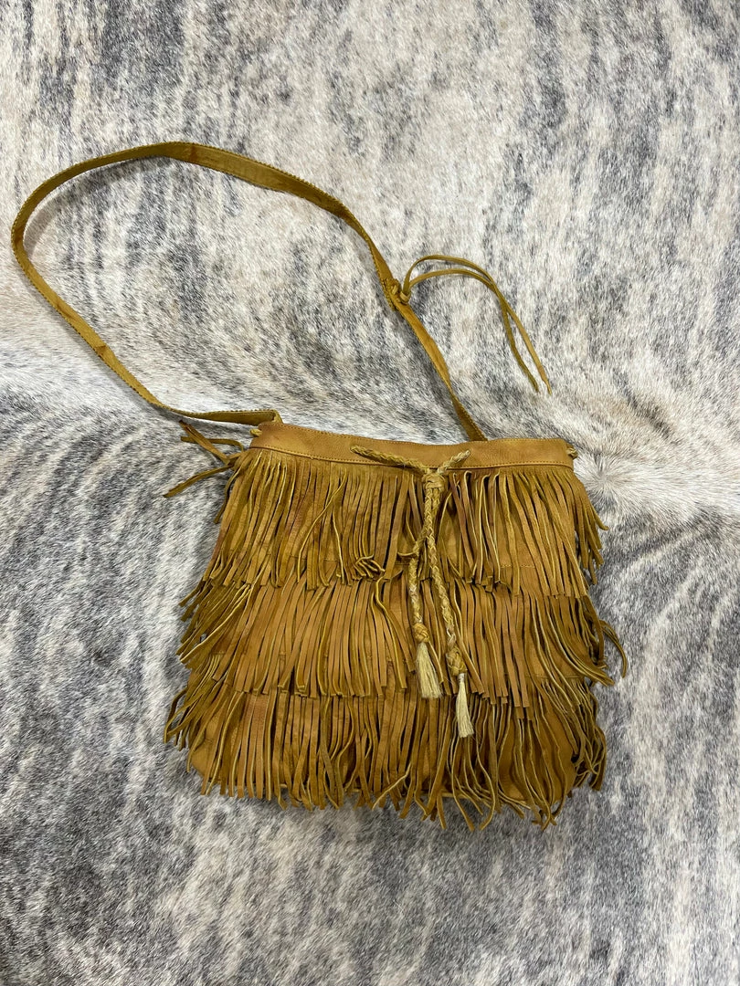 100% leather fringe bag with deep inside pocket, drawstring closure and shoulder strap.