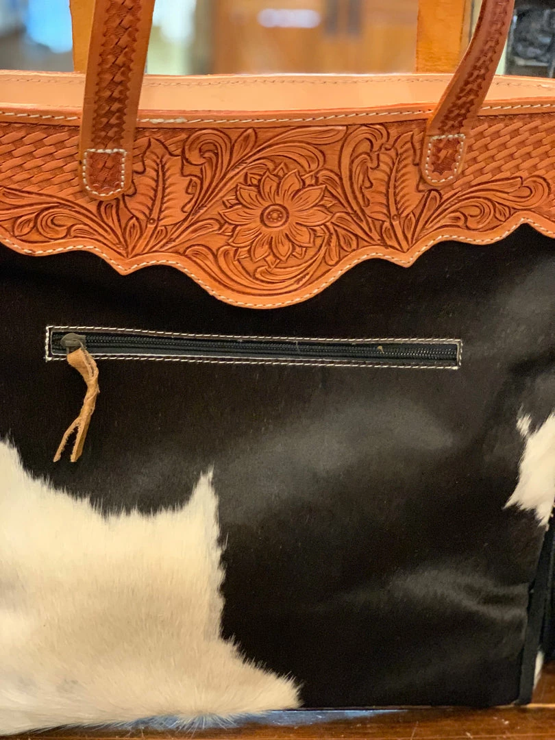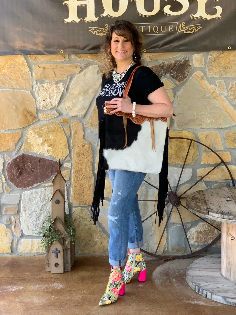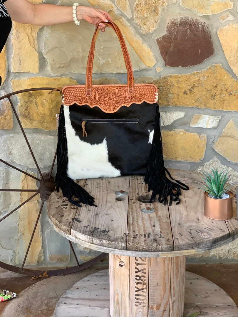 The El Paso City Fringe Tote is perfect to carry everything you need! It features hair on hide, tooled leather top and strap, and is finished off with the perfect amount of fringe!