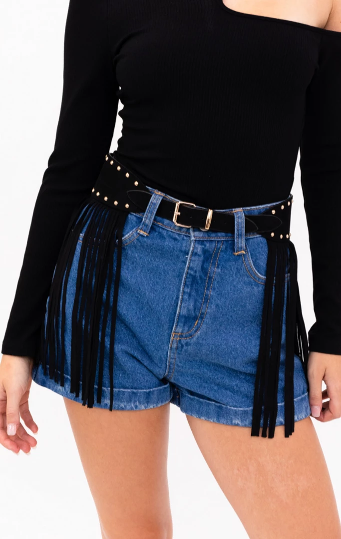 DENIM SHORTS WITH SUEDE FRINGE BELT