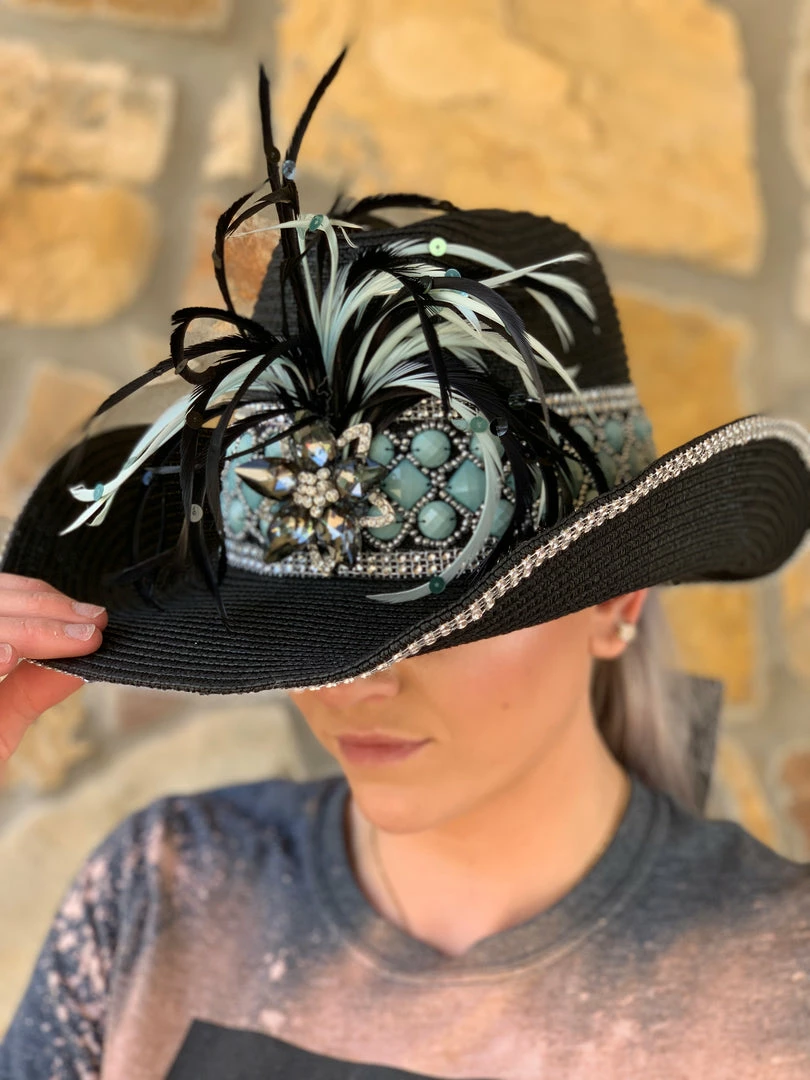 Cowboy hat with faux turquoise and silver beaded band, a spray of hand embellished feathers and star brooch. The sewn braid hat with it’s 4.5″ brim and wired edge allows the wearer to personalize the brim to one’s preferred shape. The adjustable cotton sweat band allows for varying head sizes. Available in 3 colors; White, Black & Luggage