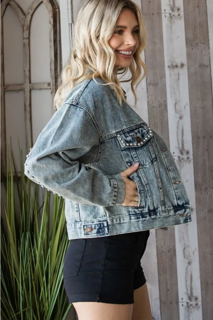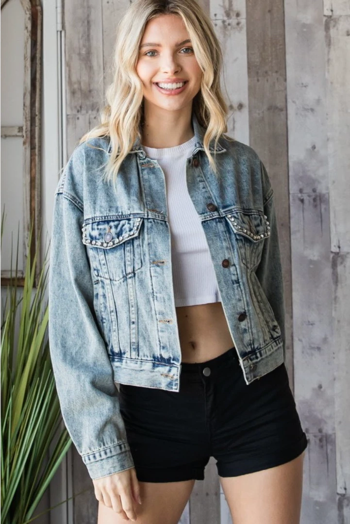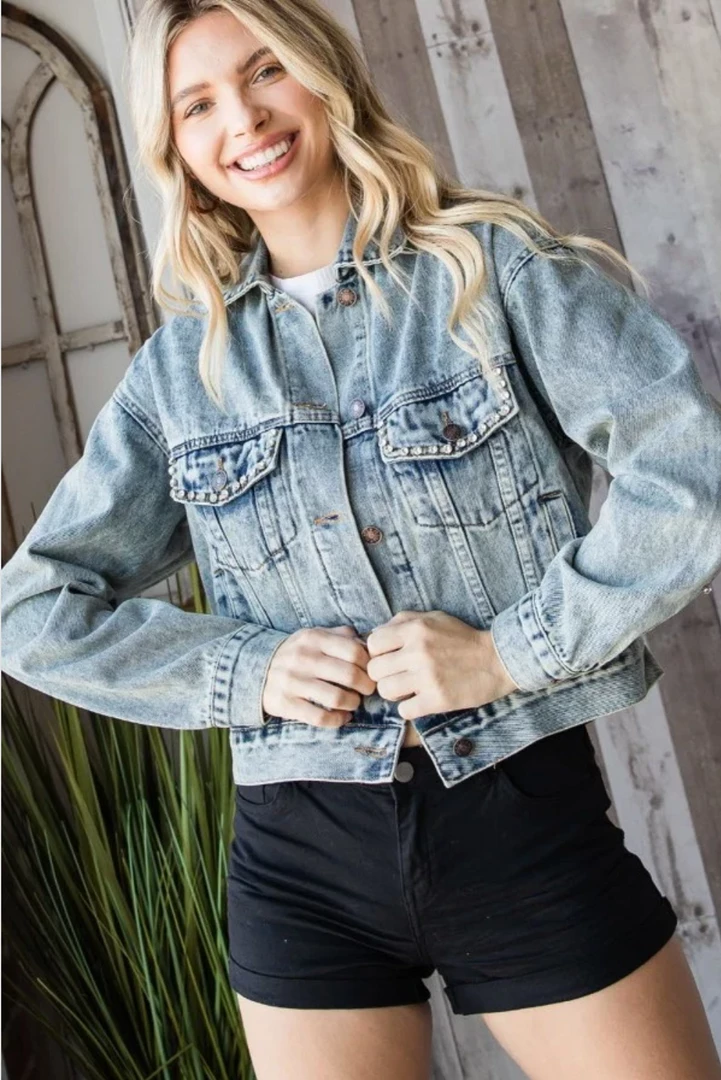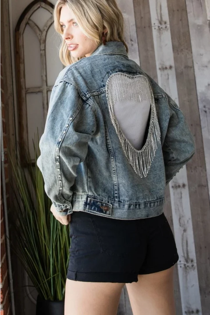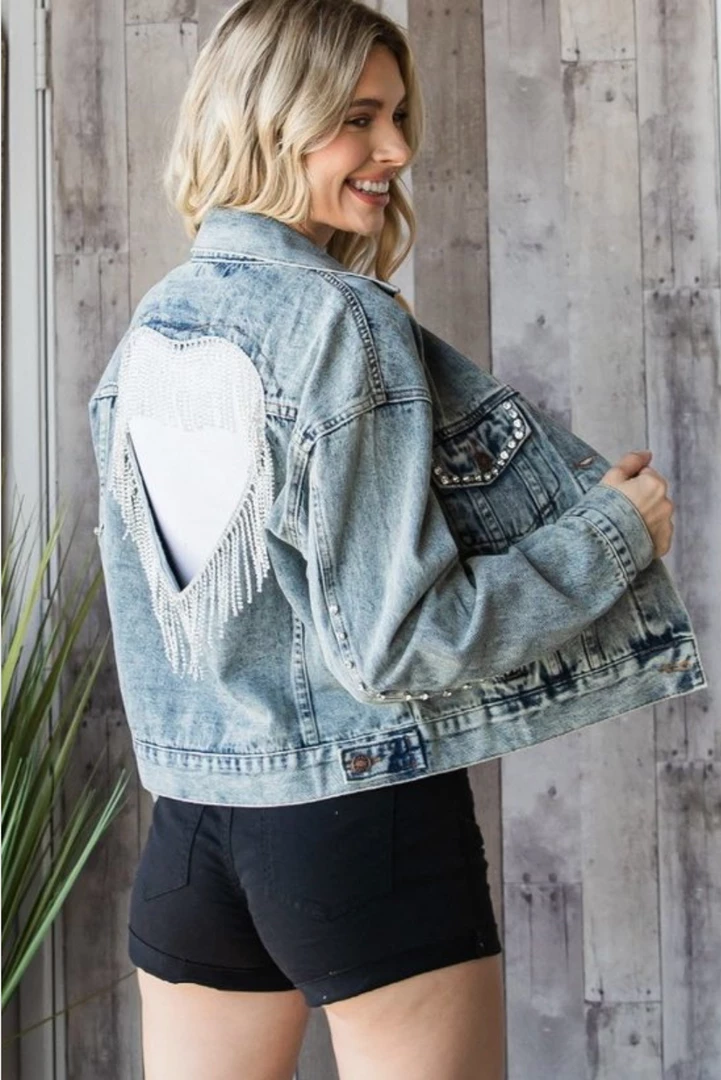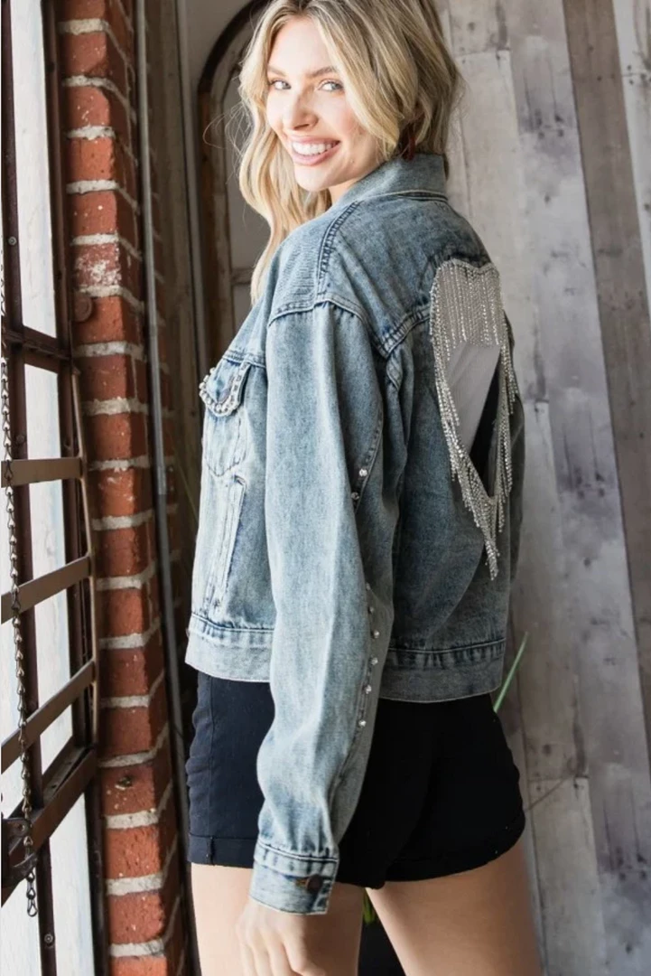 Distressed Button Down Open Heart Rhineston Back Denim Jacket