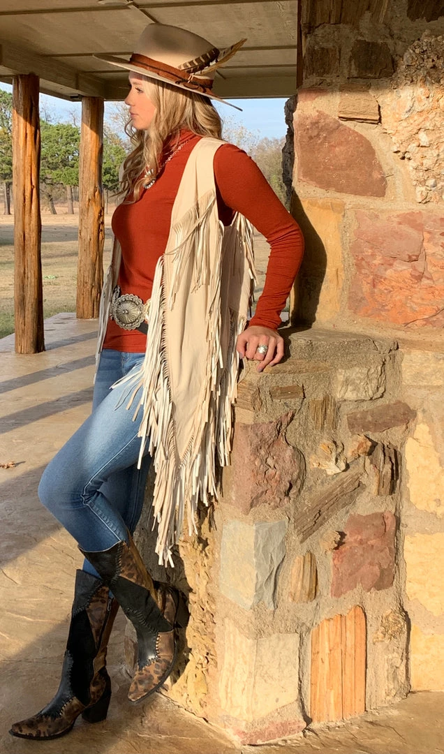 Our new Honey Creek Fringe Vest is hot through the door! This vest is ivory in color with ALL THE FRINGE cascading in a “V” pattern.