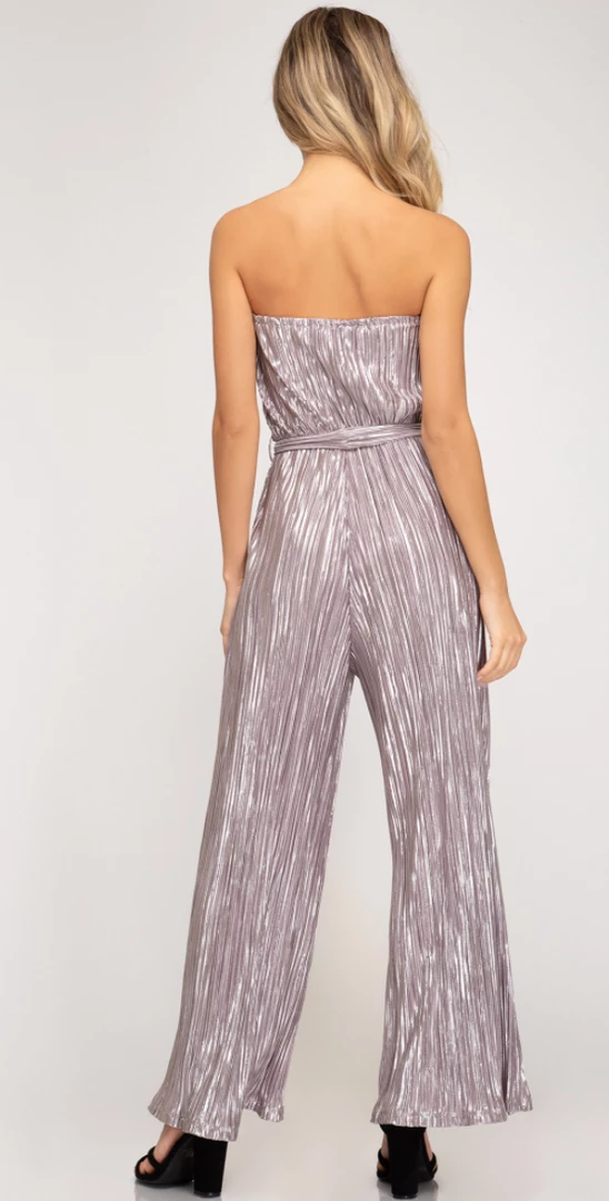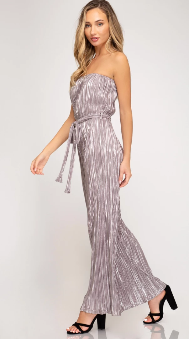 This jumpsuit is sure to turn heads. Our Jump To It Jumpsuit features a tube top, wide legs, and finished with a belt tied around the waist.
