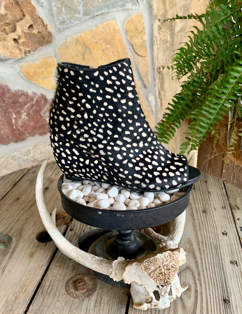 We’re wild about these peep-toe wedges. They feature synthetic hair, wedge, and side zipper for easy on and off!