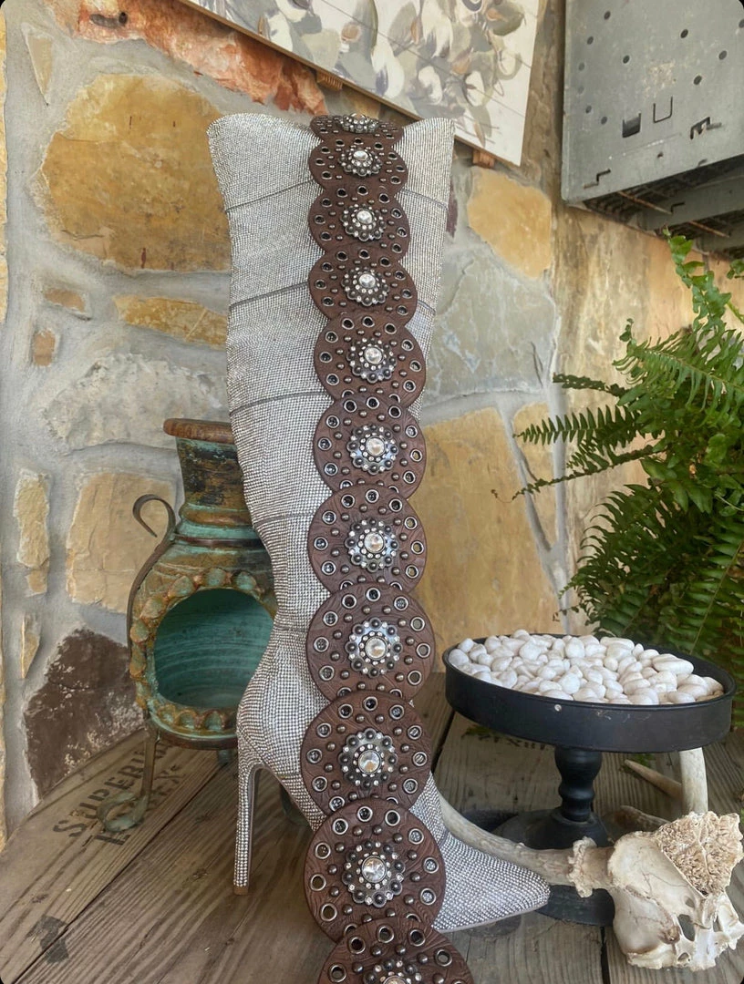 Vintage brown tooled belt displaying silver stone details. This belt could be worn to spice up any outfit! The clip will latch on to any concho, making it perfect to wear tighter, or a little looser.
