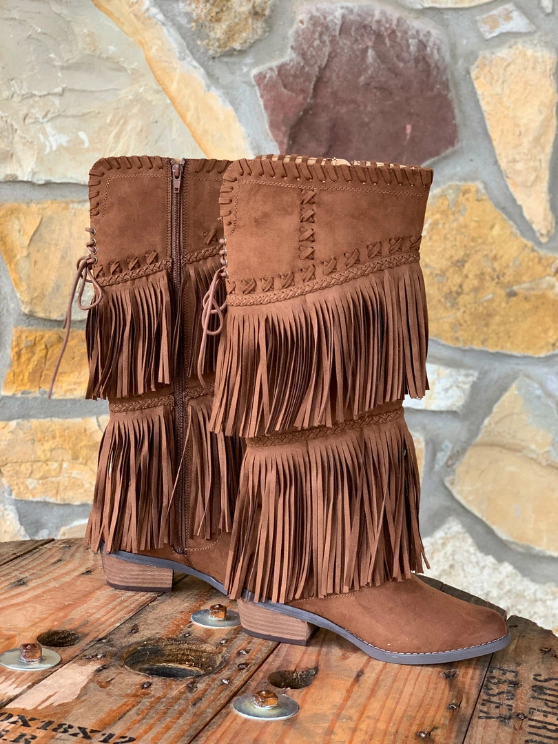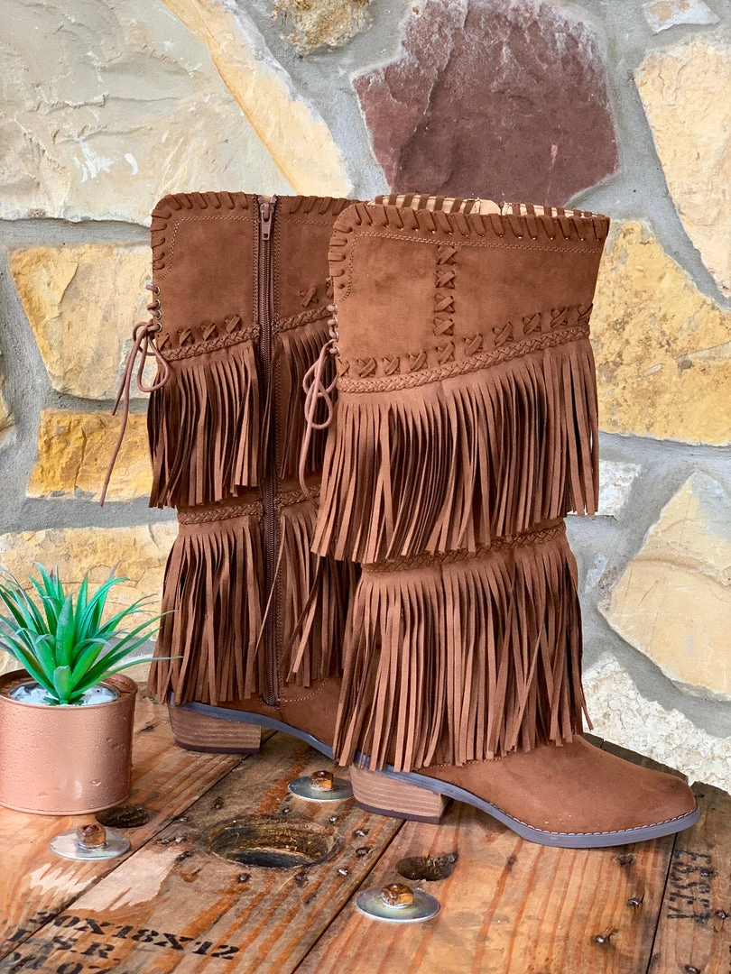 This cute boot is a show stopper!! It has a braided top, two layers of gorgeous fringe, a side zipper, and a wood heel! It also has a small lace-up back.