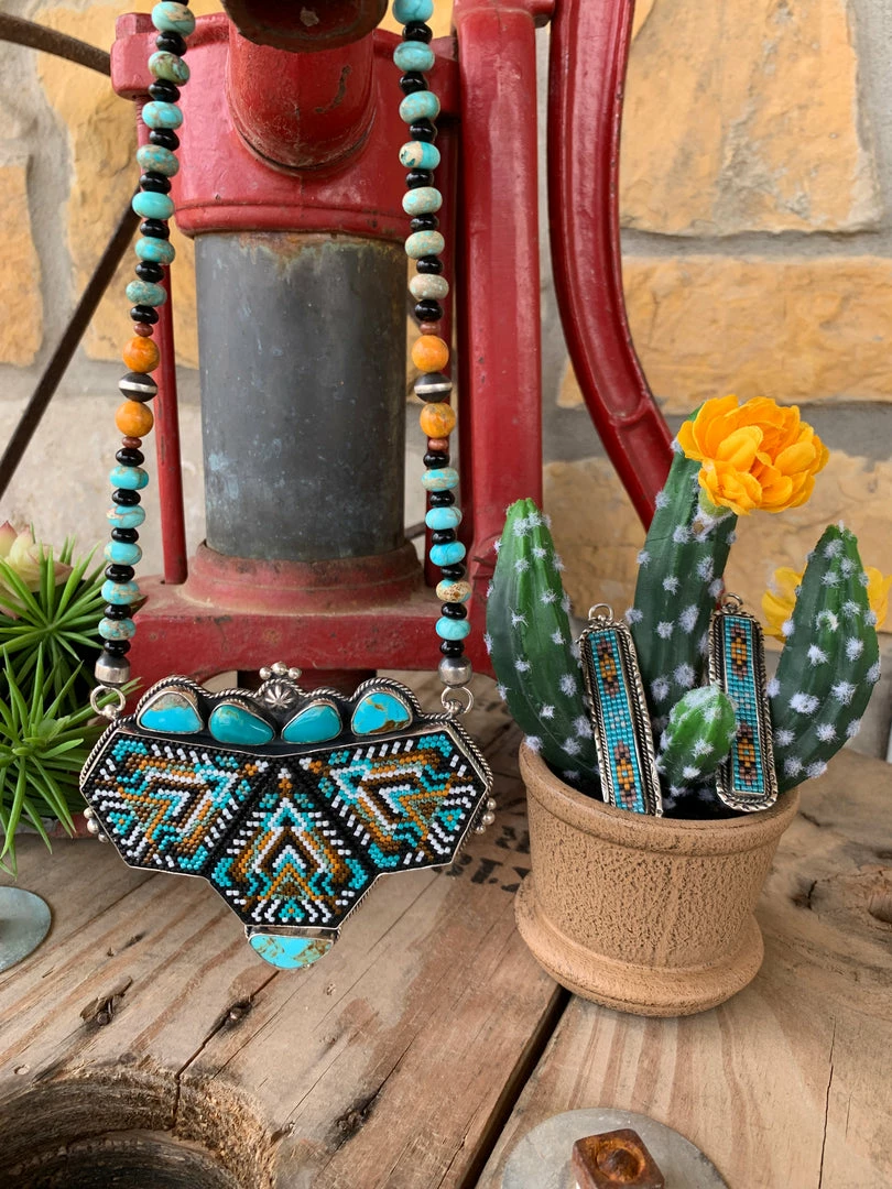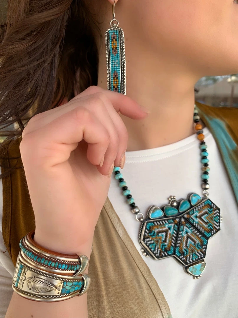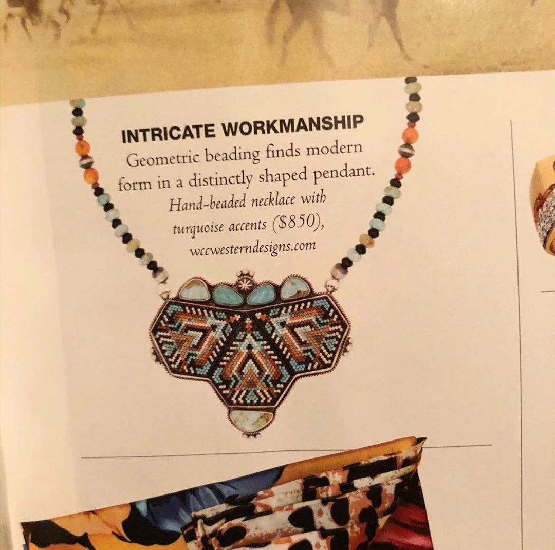 Walker Clampitt of WCC WESTERN DESIGNS creates a most stunning, innovative piece by combining the age old art of beading, with beautifully placed turquoise stone set in sterling silver featuring delicate accents.
