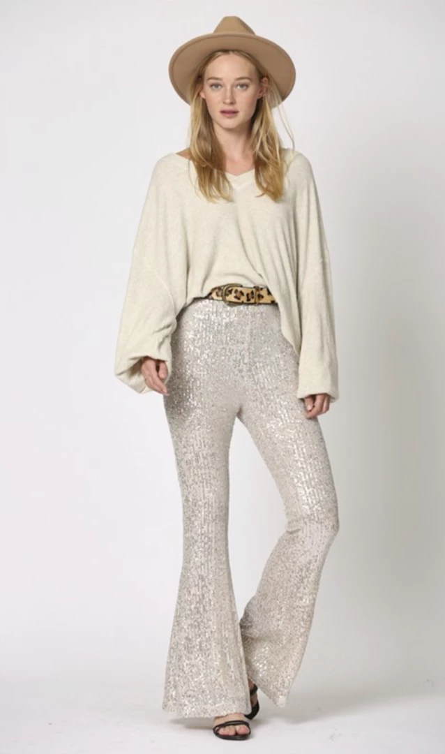 Our Night At The Disco Bells are the perfect addition to any top. These pants could be paired with a dressy top or graphic tee. They are gold with gold sequins throughout. The elastic waistband helps keep you comfortable for all day wear.