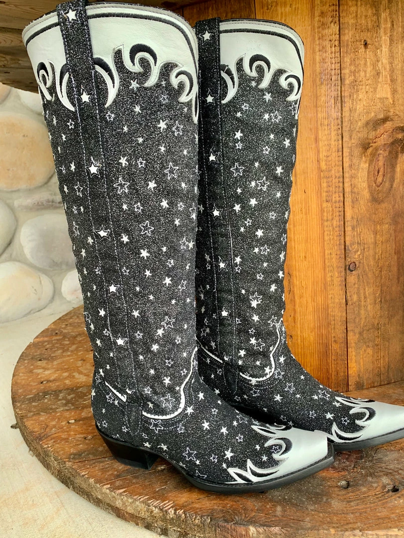 - Oh my STARS! Have you ever seen anything so gorgeous! These new beauties from Old Gringo are nothing short of perfection. They are black with white stars and white design across the top and across the toe. The glitter throughout makes them shine like the sky!!