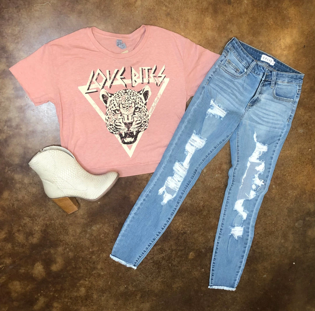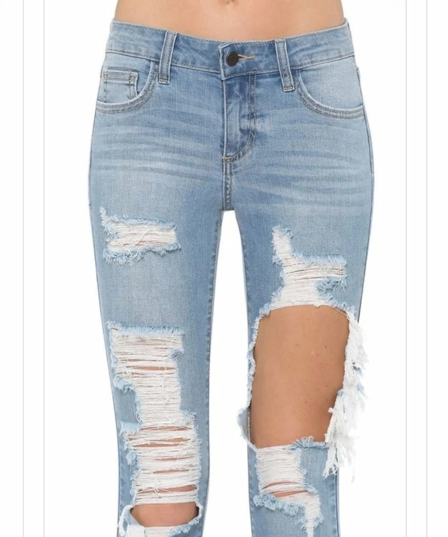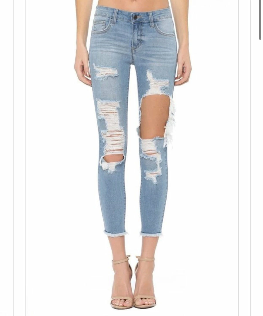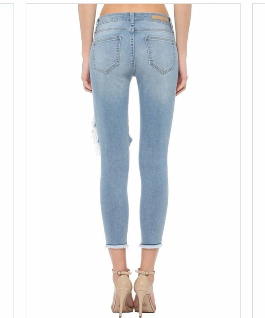 The light wash denim skinny jeans are a mid rise 26” inch fit with distressing and a frayed cropped hem. These jeans are true to size and have a little stretch to them!