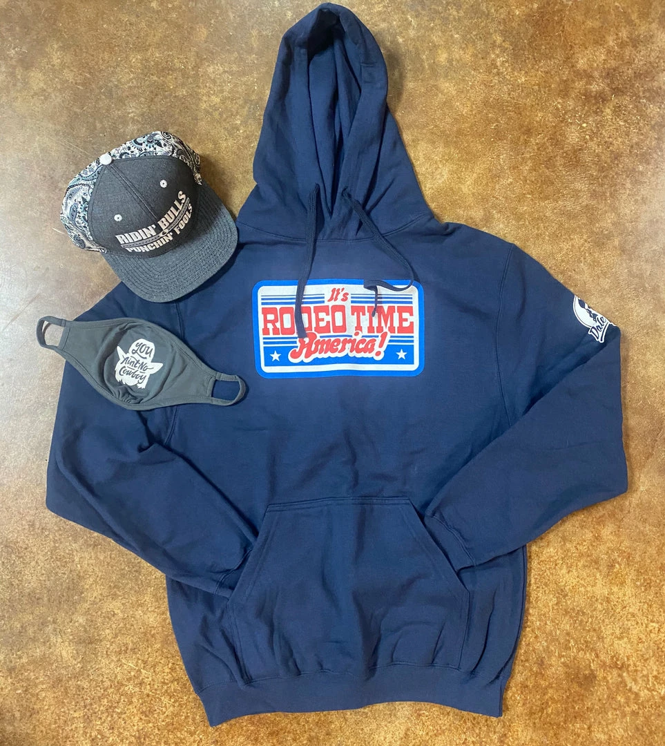 Navy blue hoodie by Dale Brisby featuring “Rodeo Time America”